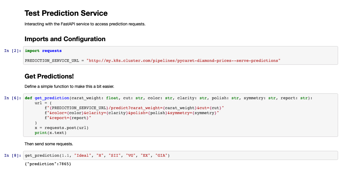 This requests that two containers (or replicas) running the FastAPI prediction service are created, with automatic load-balancing between them - nice! For more info on what this all these configuration parameters mean, head to the Bodywork docs.