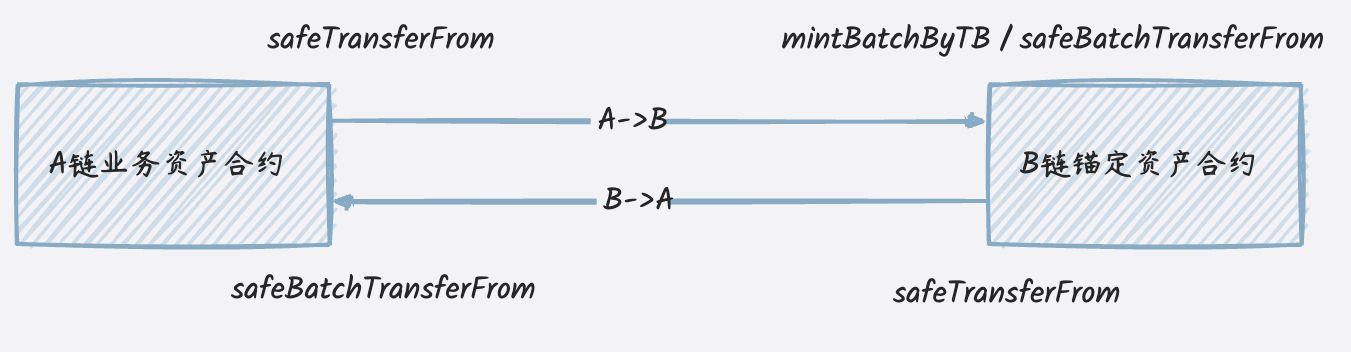 业务资产合约为遵循ERC1155标准的NFT资产合约,锚定资产合约基本遵循ERC1155标准,但根据业务需求对ERC1155标准做了一定的修改及裁剪; - NFT跨链的本质是通过跨链将A链上的资产映射到B链上,业务资产合约负责发起资产映射的跨链请求,锚定资产合约负责接收请求进行相应的资产映射(铸造或解锁)。