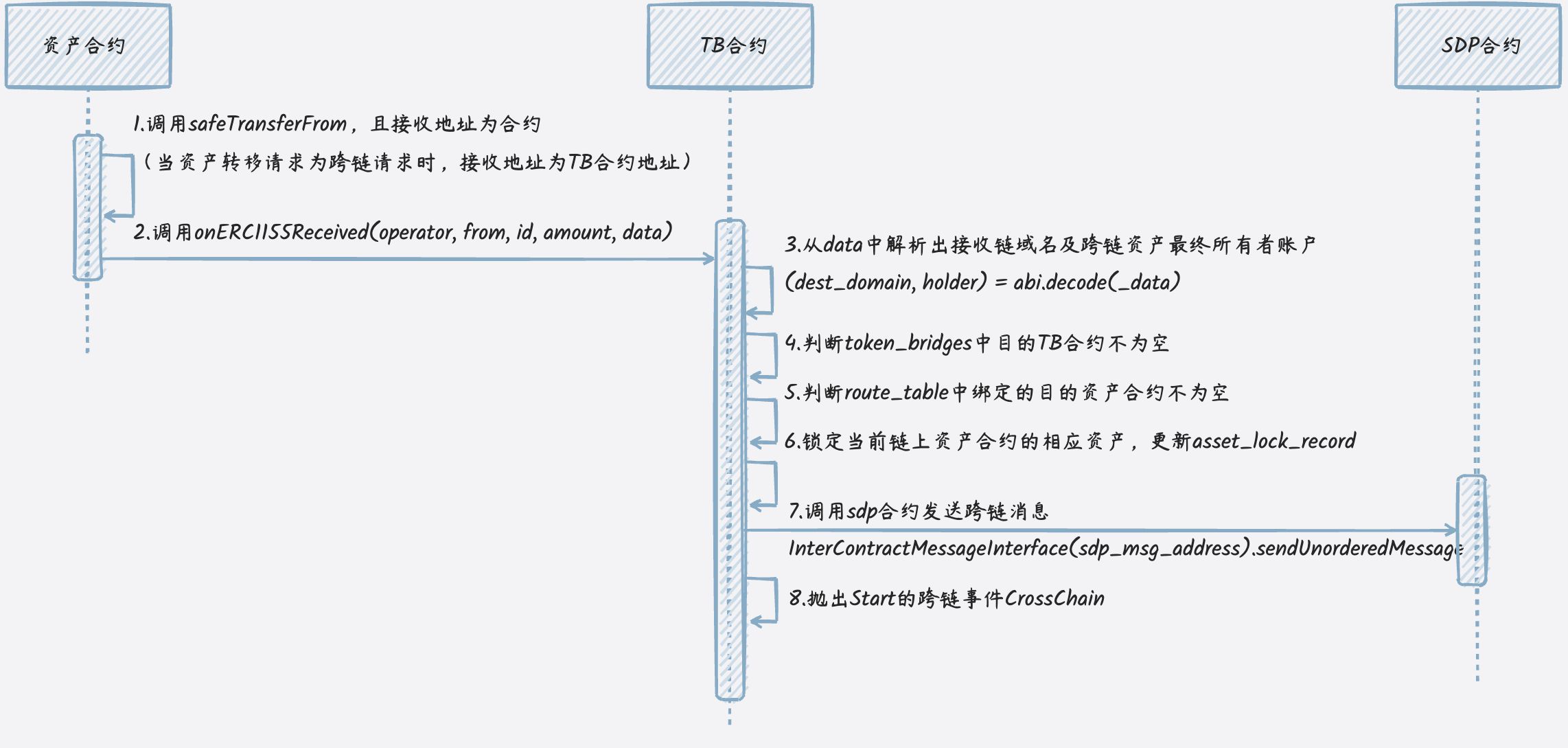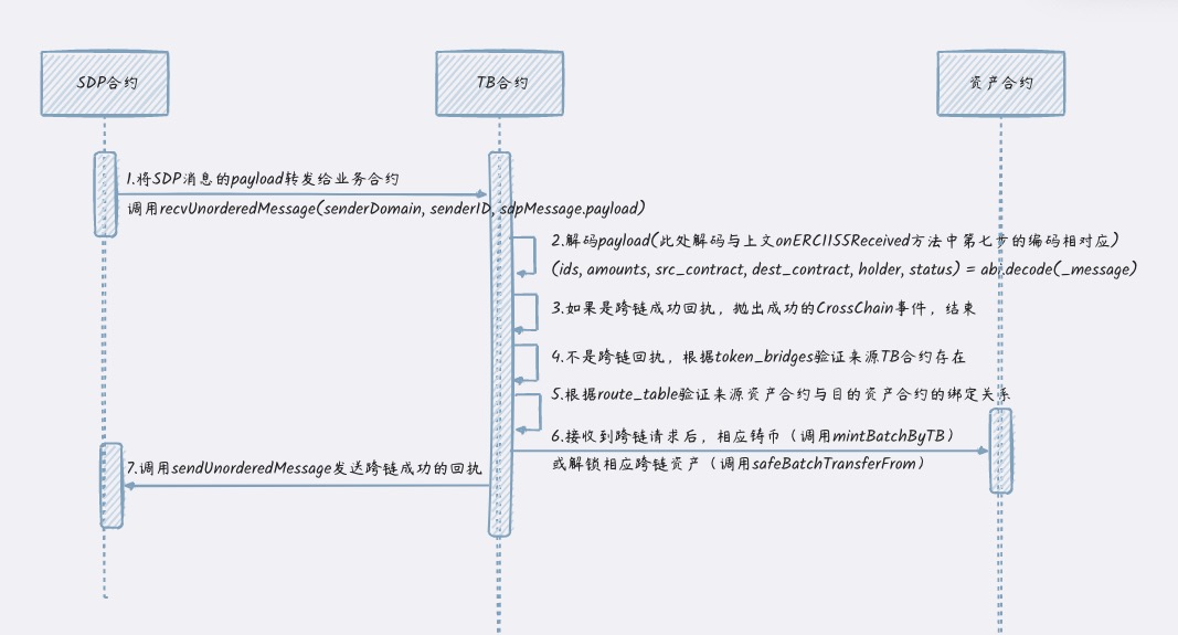 该接口一般由资产合约调用,当资产合约发起的资产转移请求为跨链请求时,会将资产接收地址设置为TB合约地址,资产合约发现接收地址为合约时会触发onERC1155Received方法的调用,工作流程大致如下:
