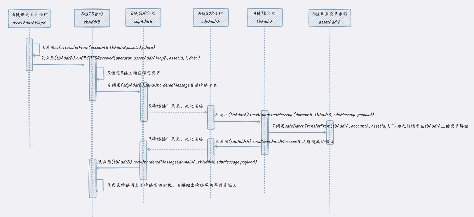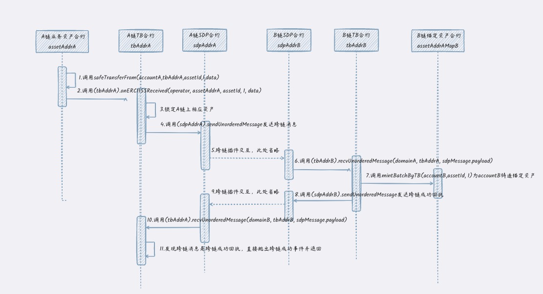 ERC1155CrossChainMapping,详见2.1节介绍。 - TokenbBridge合约:位于资产合约(资产合约包括业务资产合约和锚定资产合约)及跨链系统合约(包括AM合约和SDP合约)的中间层,负责打通资产合约到跨链系统合约之间的处理逻辑。方案给出TokenbBridge合约模板,后文中均简称为TB合约,详情见2.2节介绍。
