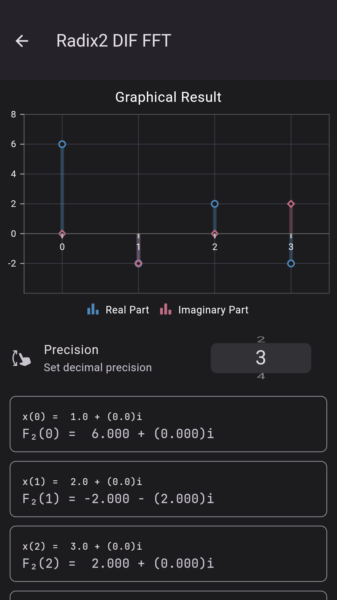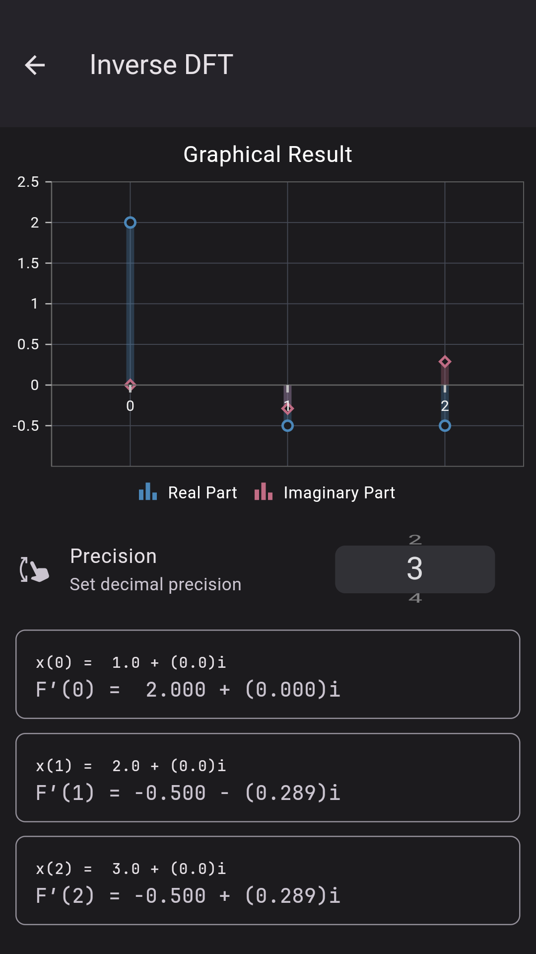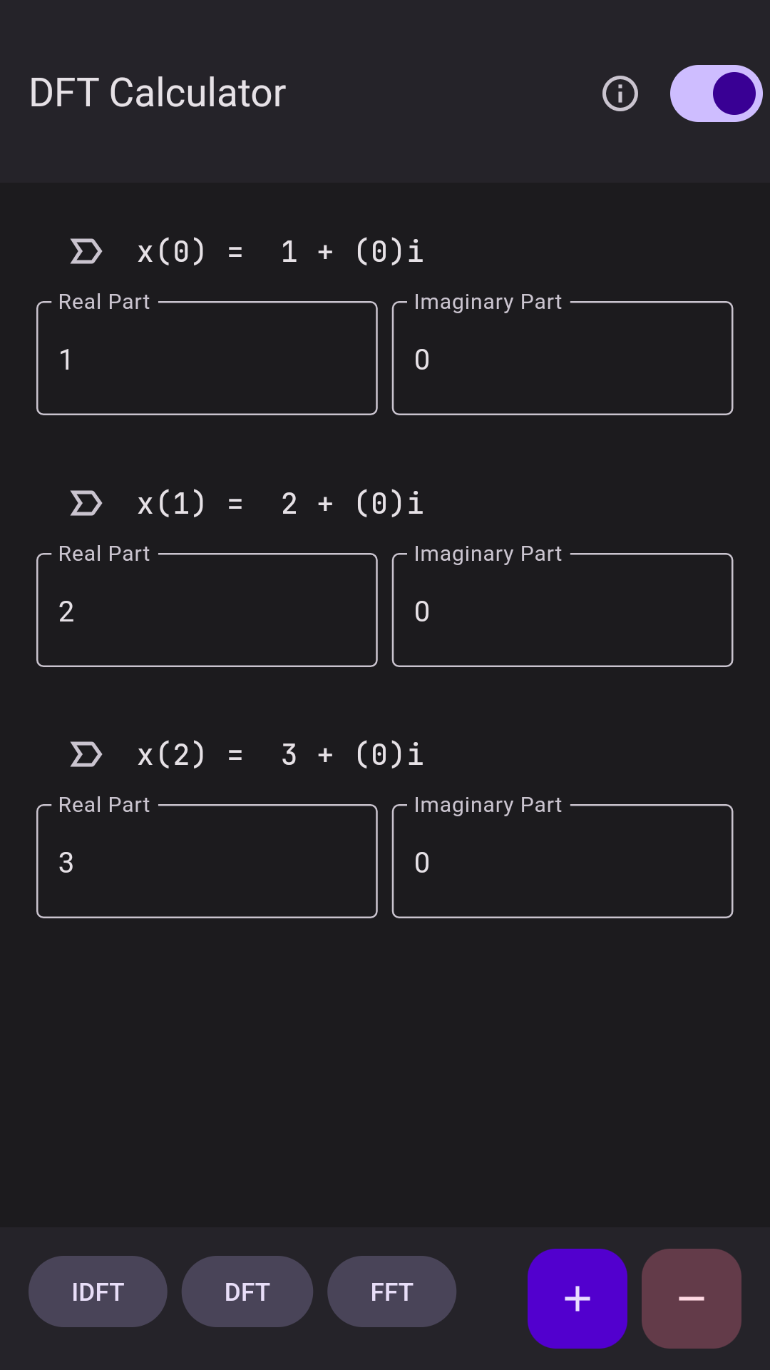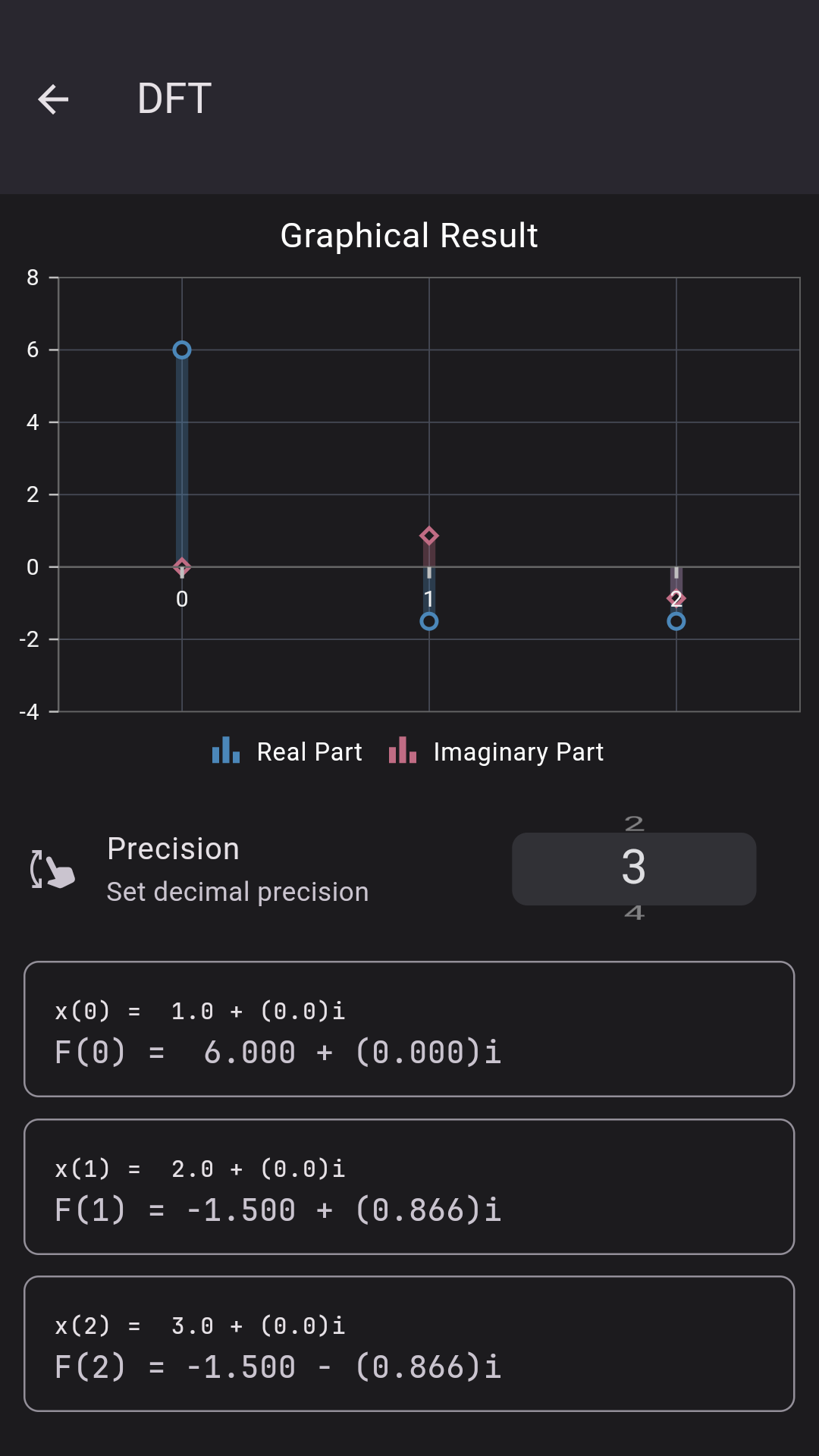 DFT Calculator and Visualizer is an assist tool for college level students enrolled in digital signal subjects. The aim of this calculator is to help students cross-verify their DFT, IDFT, and Rx2FFT problems.