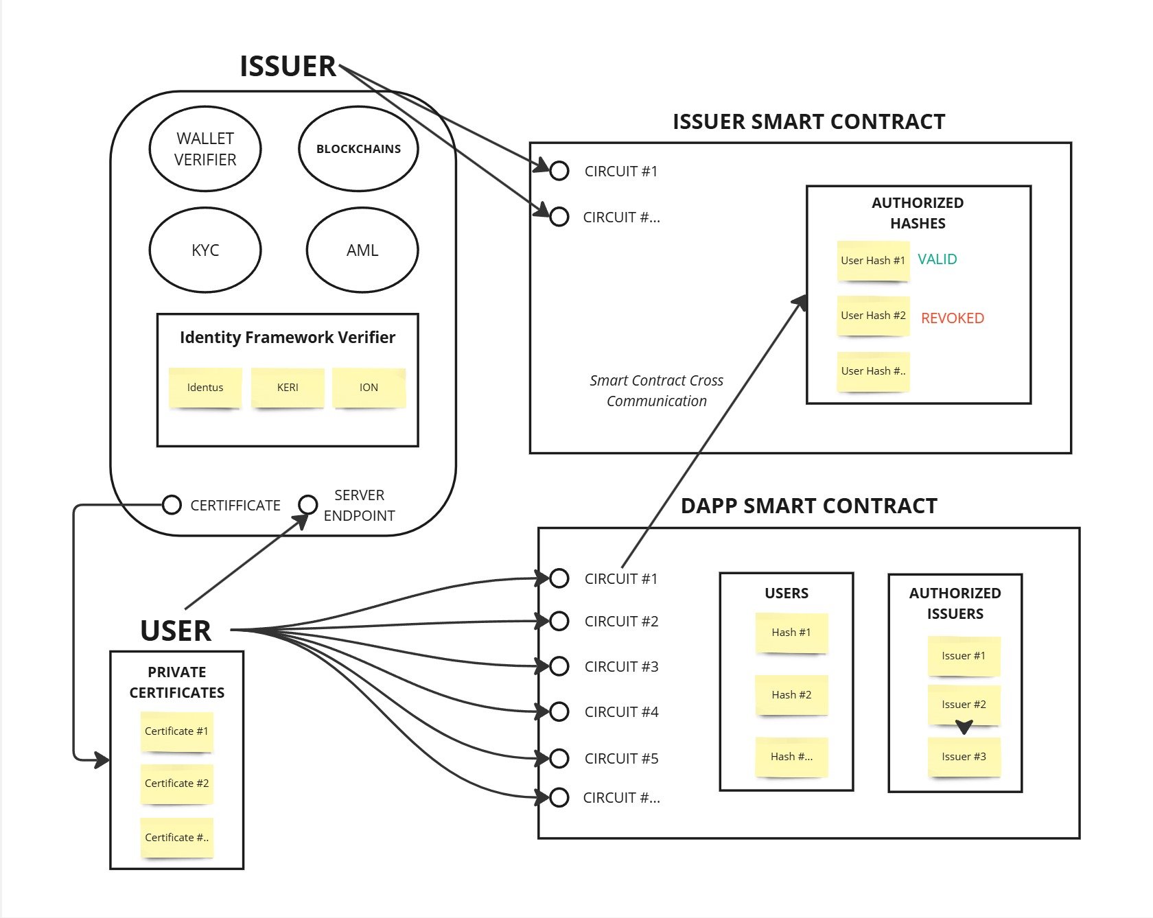 The architecture features three main participants: the Issuer, the User, and the DApp. The Issuer plays a critical role by performing various off-chain checks—such as wallet verification, KYC, and AML—to act as a robust identity verifier. In doing so, it supports multiple identity frameworks, including Identus and KERI. The issuer issues hashed certificates that prove user attributes (such as age, AML compliance, or local jurisdiction clearance) and stores these certificate hashes in an Issuer Smart Contract, marking them as valid or revoked. No personal information is exposed in this process; only the hash and its status are recorded, ensuring that sensitive data remains private.