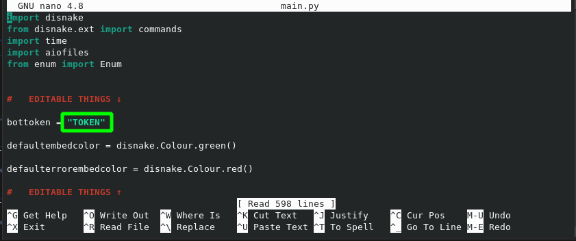 nano main.pyPaste your Token into the selcted area and exit nano with CTRL+X