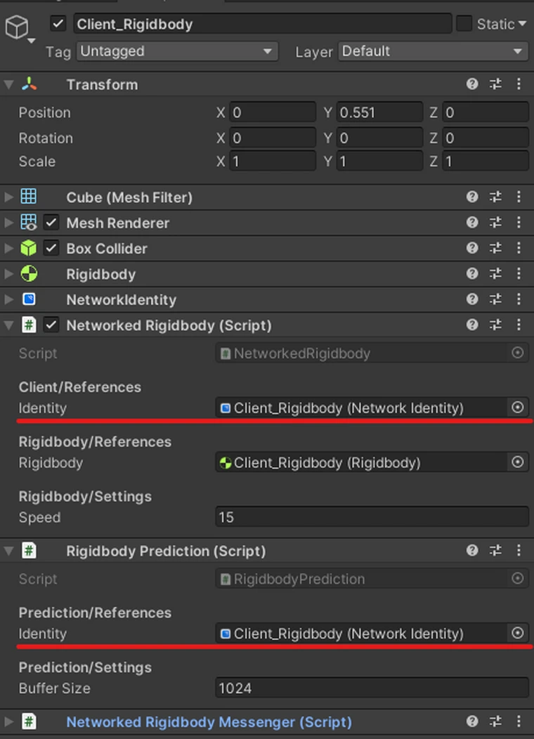 The rigidbody example scenario is still a work in progress. The bodies are simulated via the PhysicsScene.Simulate method. When not simulating, the client is moved to an empty scene created in runtime called "Idle". This implementation is simple and easy to understand, but it stops the clients interacting with one another. I recorded a demo where I simulated 150ms of lag using clumsy, and then applied a packet loss rate of 2%. Here's the Video: