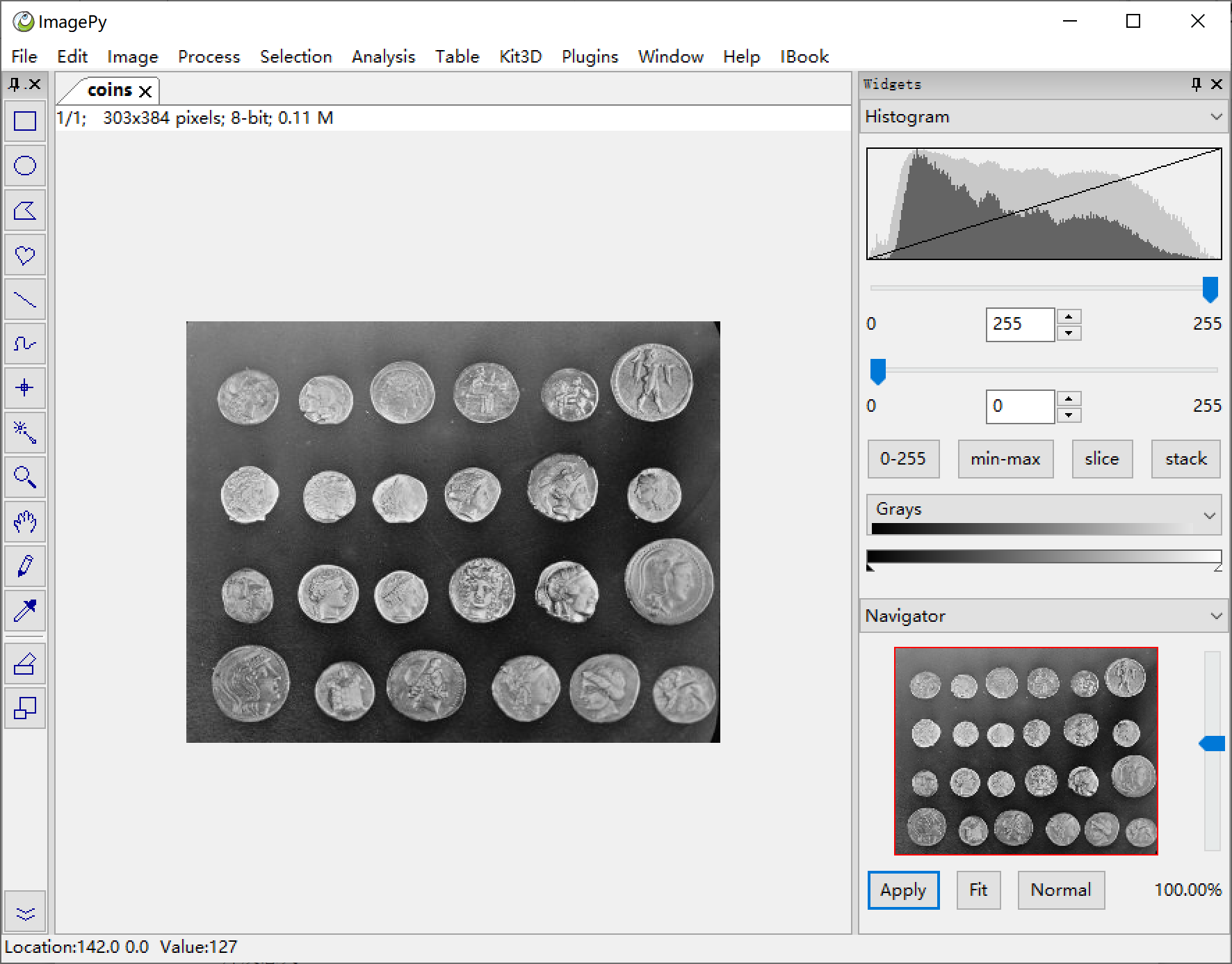 menu: File -> Local Samples -> Coins to open the sample image within ImagePy.