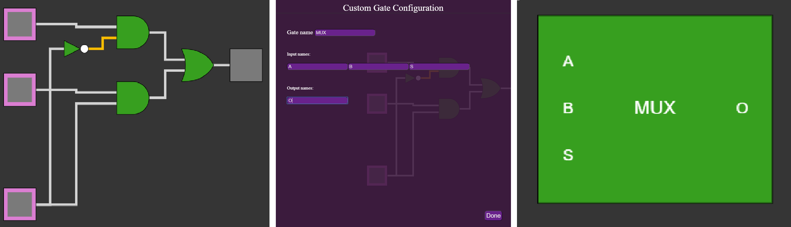 Custom gates are boxes that hide a circuit. They are simulated as if the internal circuit of the gate was in the simulator itself so it is possible to make latches inside custom gates. To create a custom gate, one can place input and output gates and connect them via some circuit. The input gates will be the inputs of the custom gate and the output gates will be its outputs. When the circuit is done, one can click create custom gate on the bottom left of the screen (in build mode) to start the custom gate generation process. This button will open a popup where the name of the gate and the names of its inputs and outputs can be chosen (inputs and outputs are ordered by height i.e. the ones on the top are displayed first in the name selection menu). Then pressing Done will make the simulator display the code to generate the custom gate and generate one automatically. It will also generate a save file (.lgs) that can be imported using the Import button.