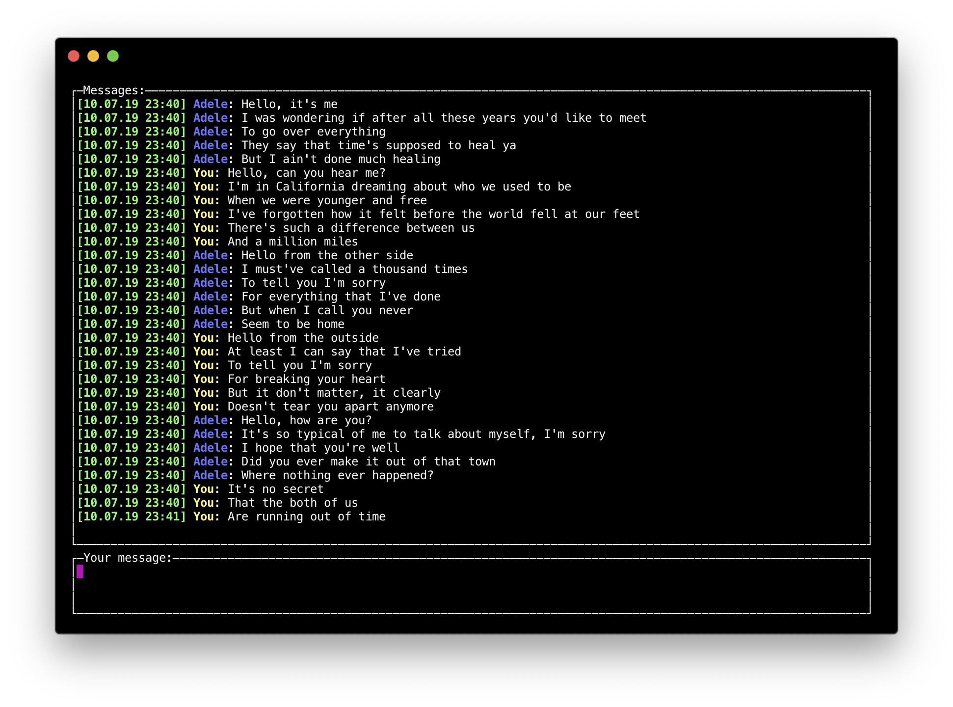 Go TCP socket chat About Naive implementation of TCP client-server multiuser chat. Server communicates with clients via JSON Client has slick console-based user interface and old-school ICQ notification sound 🤓 Technologies Go GOCUI Beep