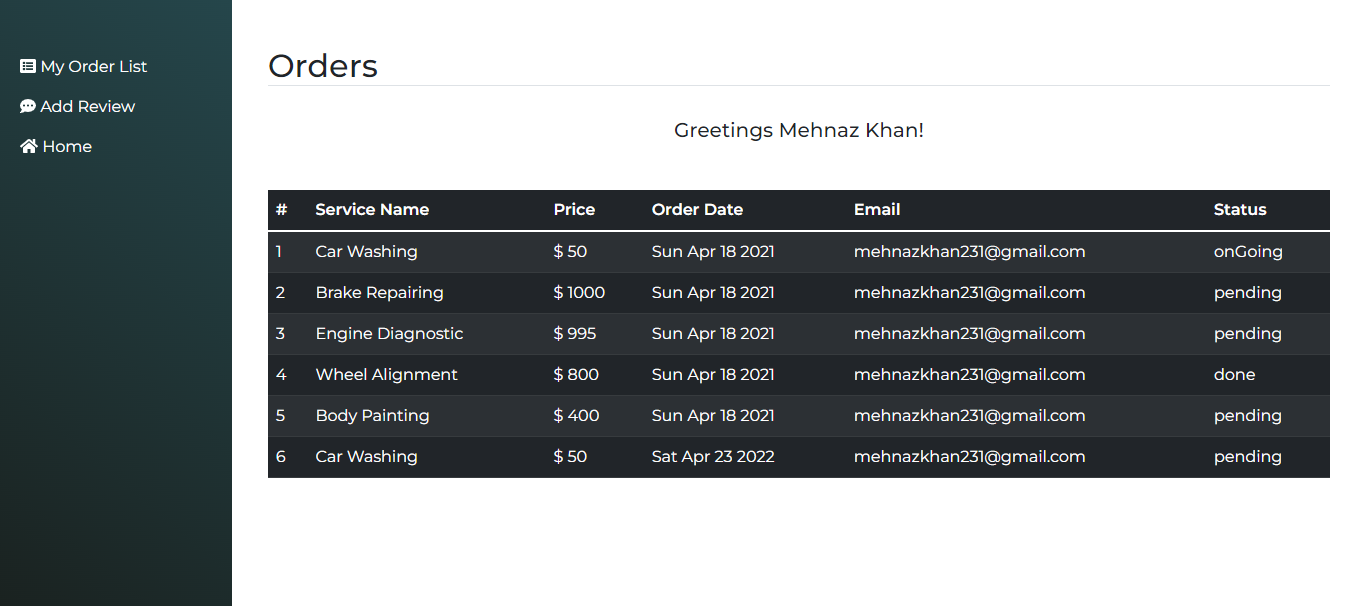 User can book a service, can pay with card (integrated payment gateway method specifically Stripe Payment). User can view his/her orders (along with status) and provide reviews which is shown on the review section of the homepage dynamically.