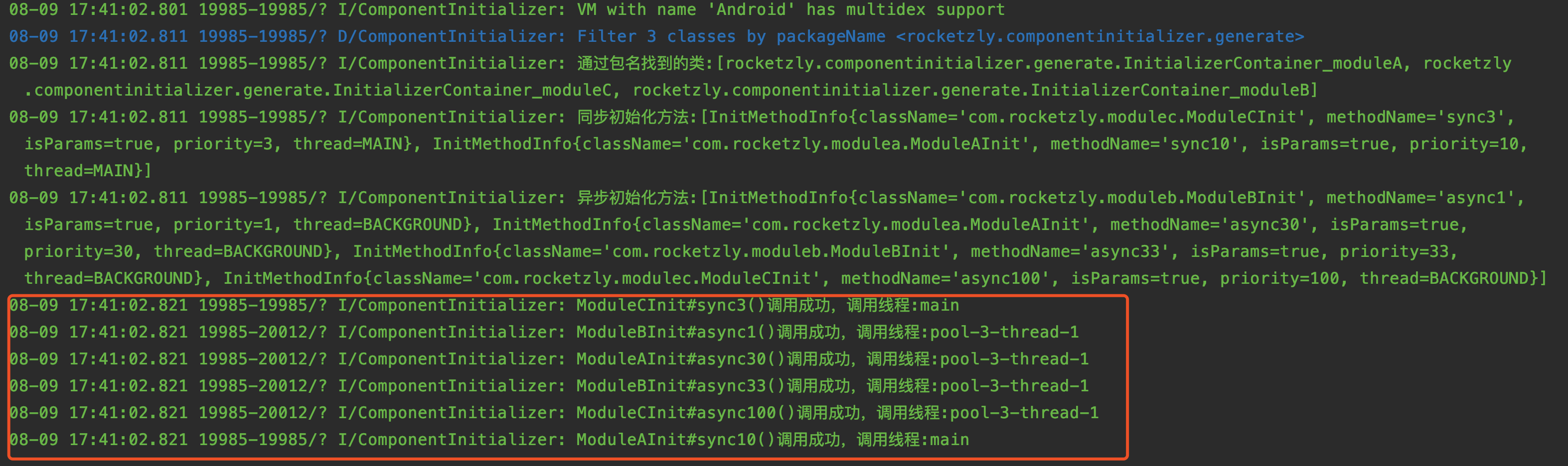 .start(this);将debug设置为true的时候可以通过标签ComponentInitializer的log日志查看执行情况