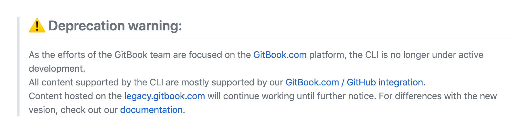 <img width="925" alt="スクリーンショット 2019-06-29 17 23 00" src="https://user-images.githubusercontent.com/16184855/60381625-9a87bb00-9a92-11e9-99af-952031ba2b8c.png"> https://github.com/GitbookIO/gitbook#%EF%B8%8F-deprecation-warning 移行先の選択肢: - https://github.com/rust-lang-nursery/mdBook - https://github.com/mkdocs/mkdocs/ - https://docusaurus.io/ mdBookが良さそう.