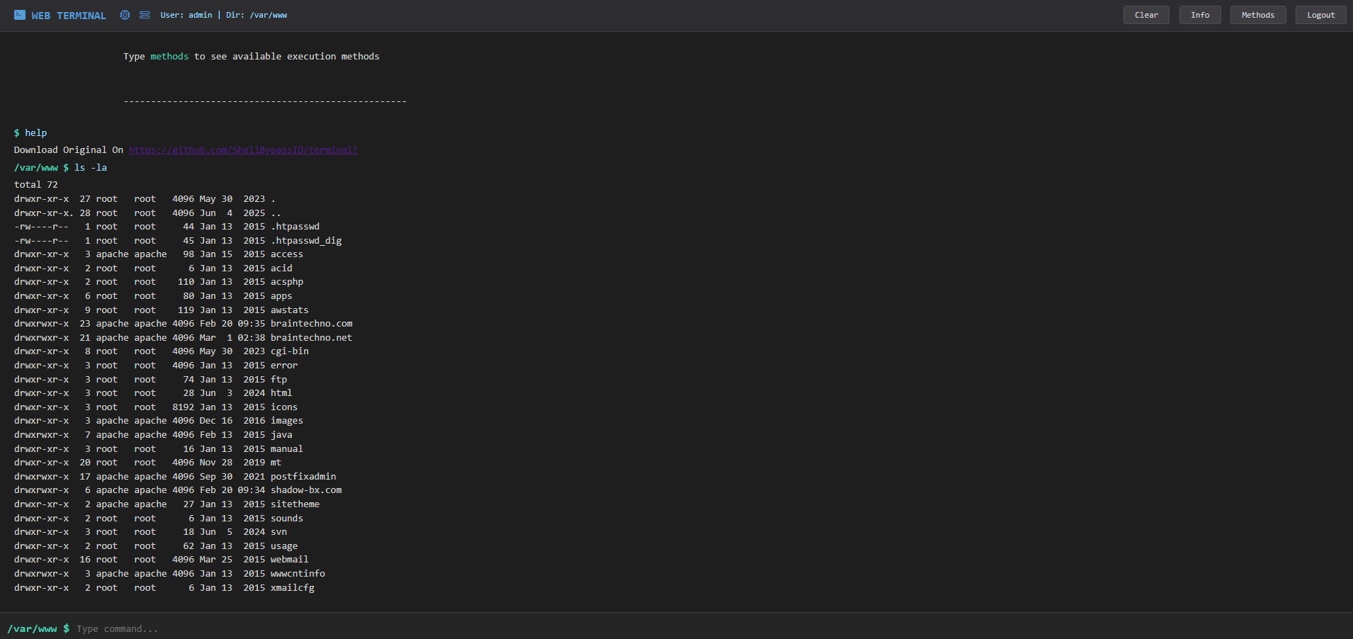 Web Terminal adalah sebuah aplikasi PHP yang menyediakan akses terminal melalui browser. Dilengkapi dengan berbagai metode eksekusi perintah dan fitur-fitur canggih untuk memudahkan administrasi server.