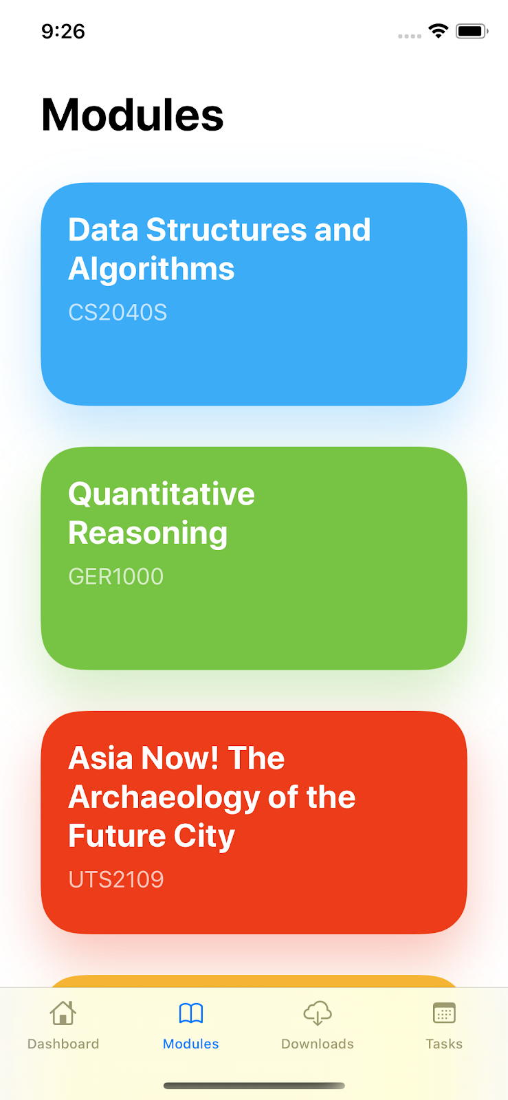 Aim We hope to create a better user experience of LumiNUS on iOS mobile devices (specifically, iPhone) with our application named “Lunaris” - nice-looking (hopefully sticking with the Apple SwiftUI design code), intuitive user interface, with a useful and easy-to-use download function and file managing capacity, as well as a task ranking and tagging system.
