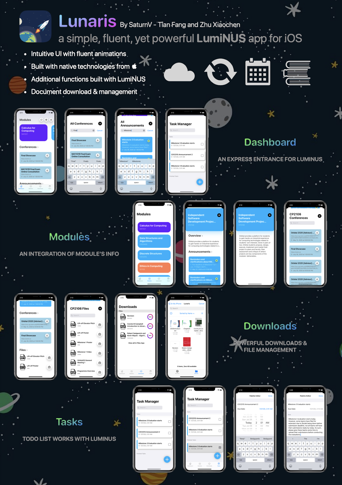 Scope of Project Our Lunaris App offers an elegant way to download files and manage tasks on LumiNUS. The iOS app starts with an interface with 4 tabs - Modules, Announcements, Files and Profile. These functions (except Files) provide the basic functionality of the LumiNUS platform as the website does. A download function with file management system can download files from LumiNUS and allow users to do basic operations on the downloaded files. A task management system to allow the users to manage their LumiNUS tasks - order the priority of the tasks, mark them as done or remove the tasks. Features to be completed by the mid of June: