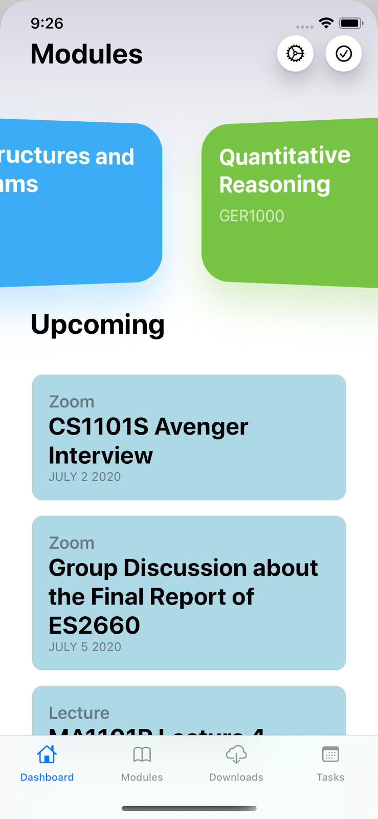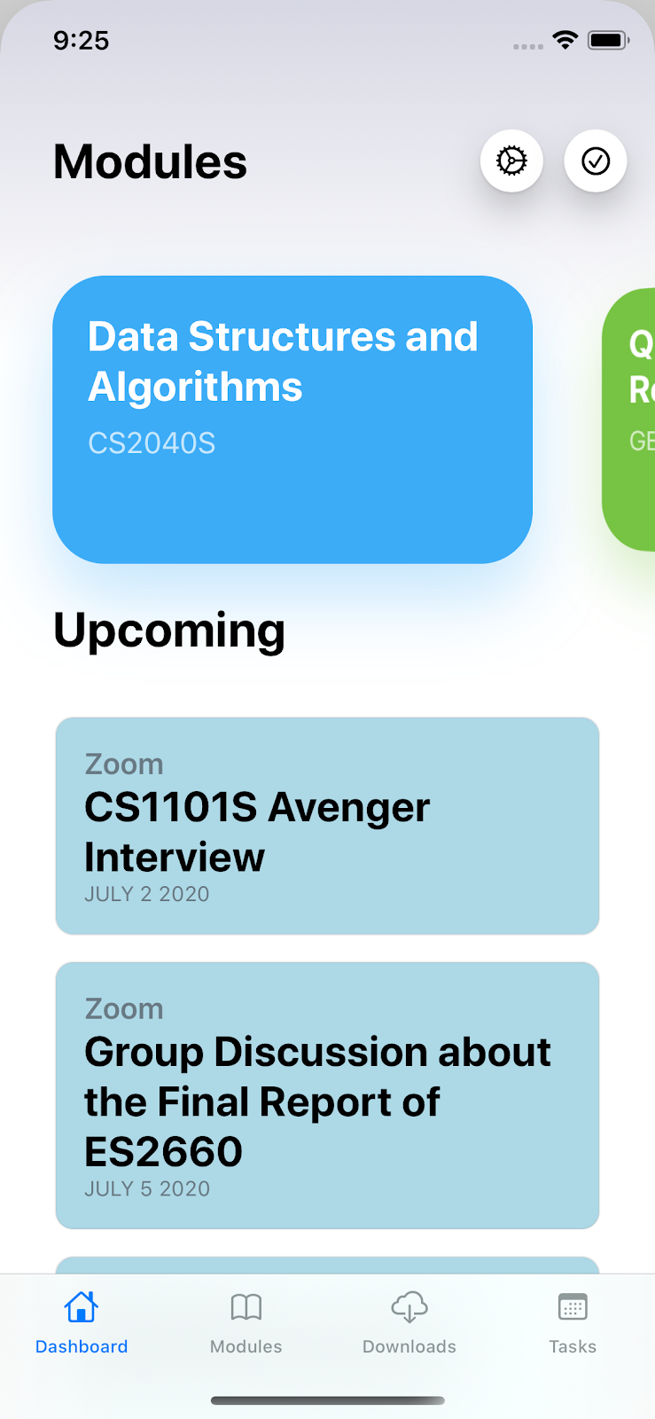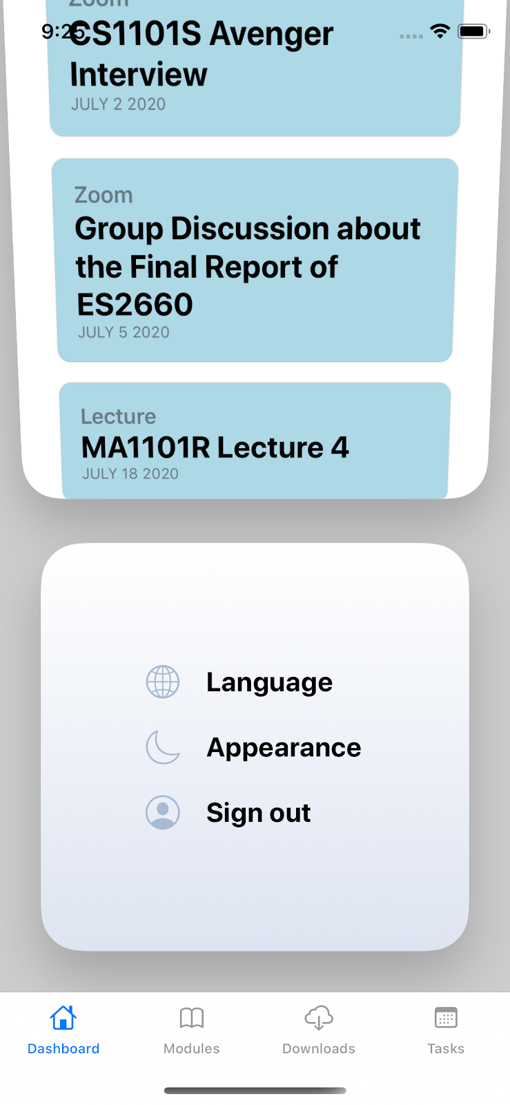 Cards showing modules taken this semester with fantastic animationShow upcoming eventsChange Preference (Appearance, Language, etc)Quick access to todo listNice animation revealing the preference tab