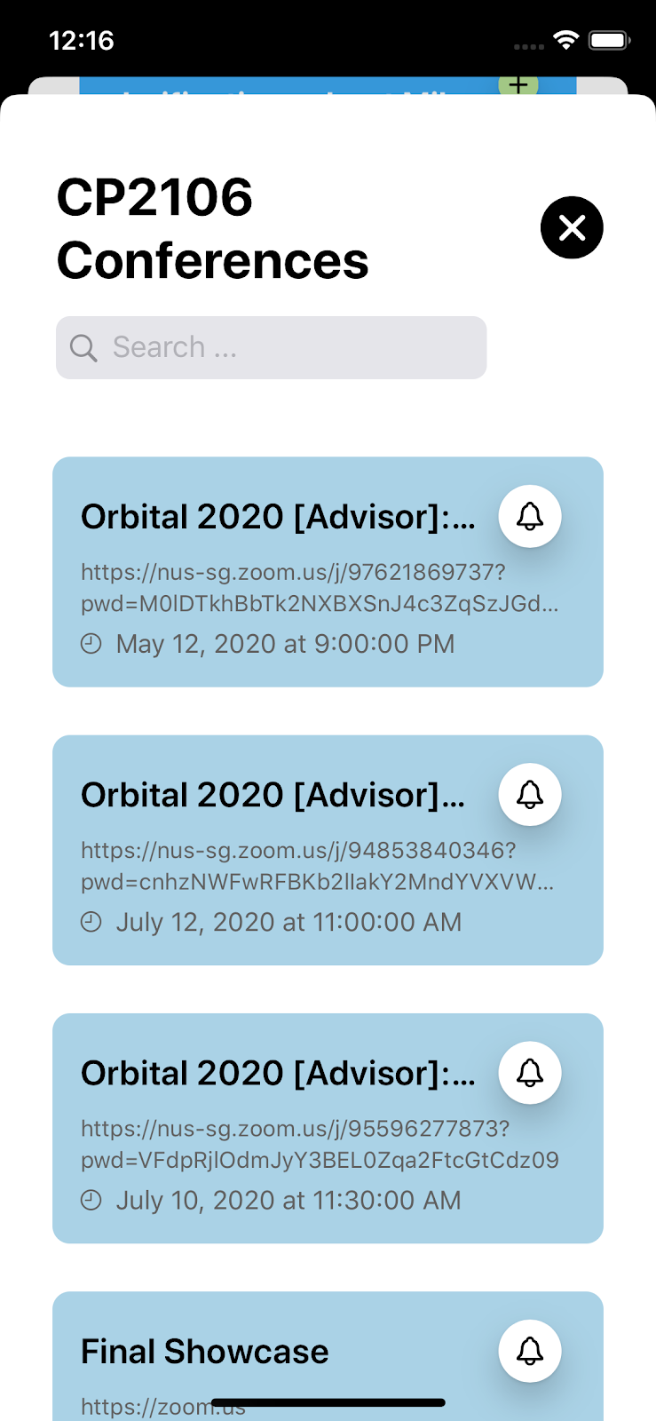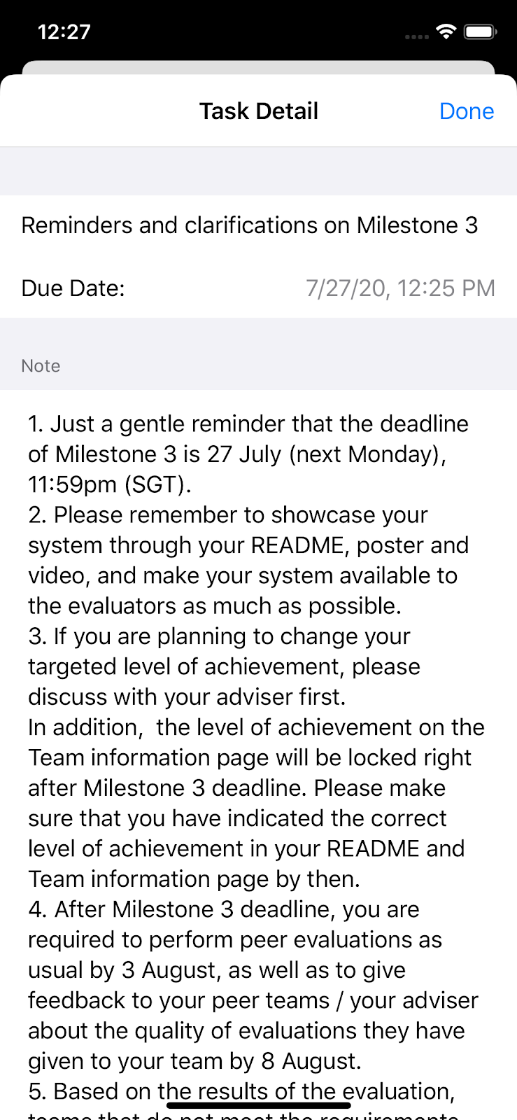 Default to be retrieved from LumiNUS Tasks section or Conferencing section.Allow users’ customisationadd new tasks or scheduled meetingsdelete existing tasks or scheduled meetings (maybe someone of the same group has submitted and no need for you to work on this anymore, or scheduled meetings that are not your time slot)modify tasks or scheduled meetingsBuilt with iOS native technologiesSwiftUICoreData, such that the app can maintain the effects of user's operations later