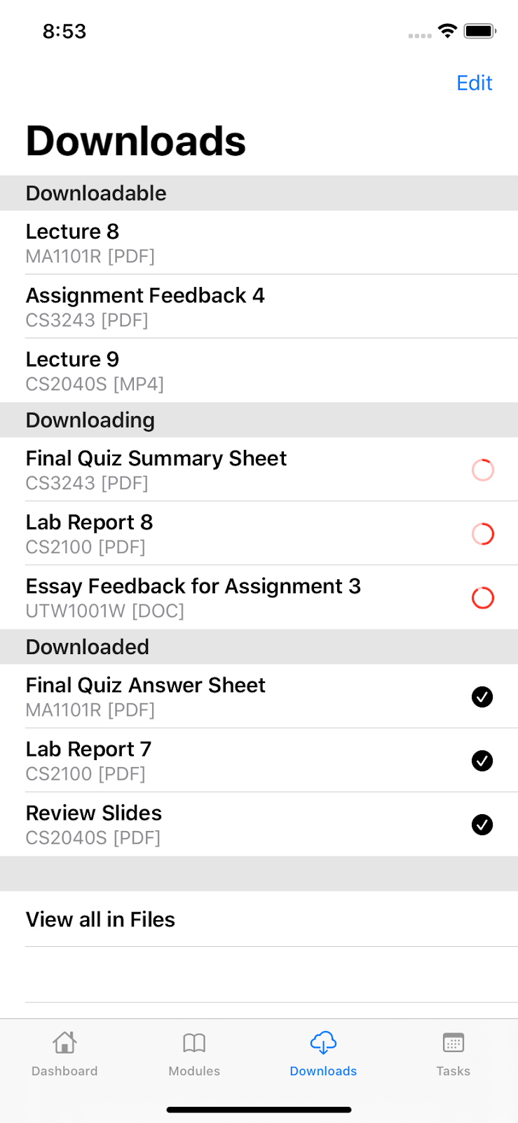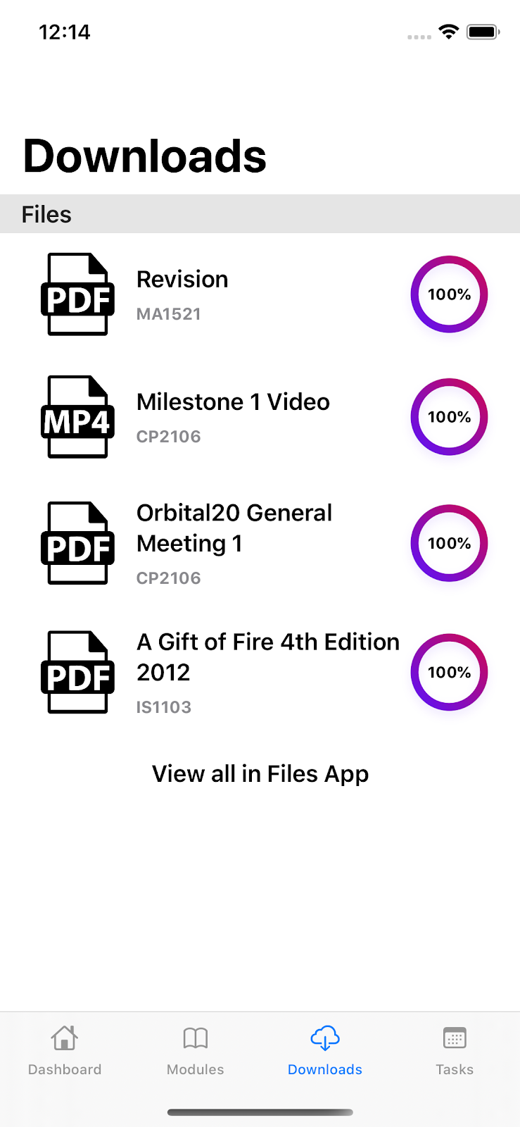Shows all downloadable files from LumiNUSShows all downloading files, with a circle progress bar to indicate progressShows all finished downloading tasksA button to show everything in the Files app of iOS