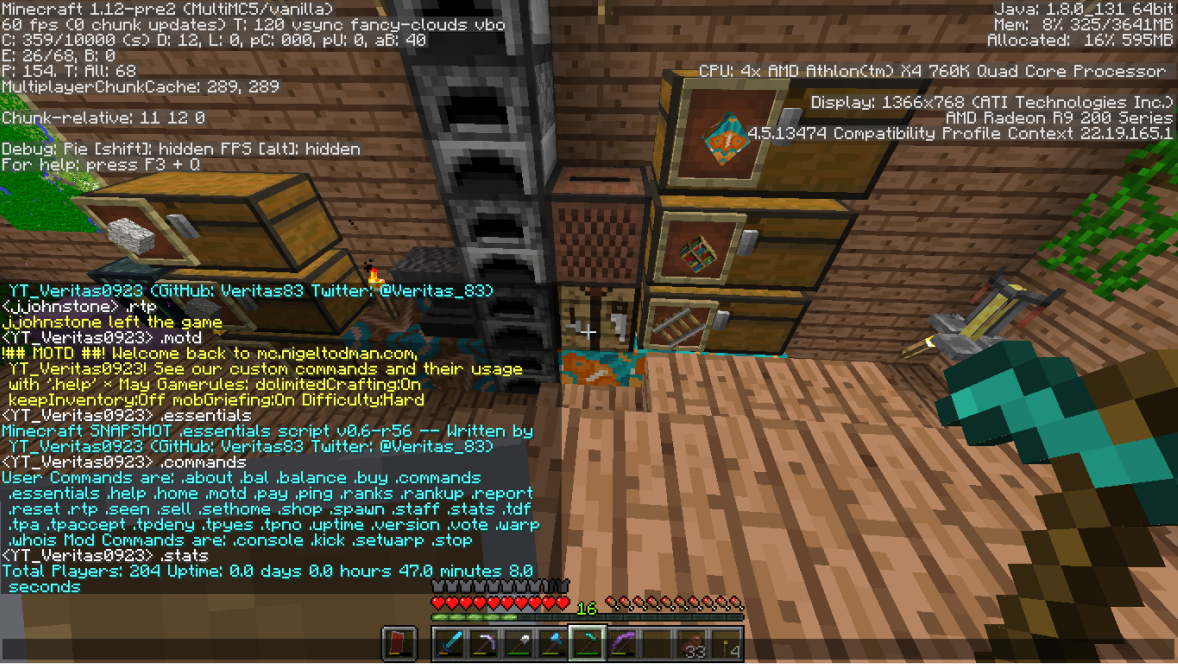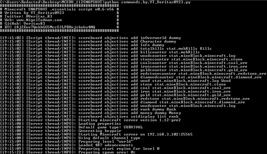 Lines 179-204: ## Start Config ## javacmd = 'java -Xms128M -Xmx4G -jar minecraft_server.jar nogui' # Java command line to start Minecraft Server jar, Must use nogui spawn = "0 64 -3" # WorldSpawn Coordinates rtpradius = 35000 # Random Teleport radius (-35000,35000) useautosave = True # Use Autosave? useautoclear = True # Use Autoclear? usemoney = True # Use Money? usewarp = True # Allow .warp? usehome = True # Allow .home/.sethome? usertp = True # Allow .rtp? useshop = True # Allow .shop/.buy/.sell? usespawn = True # Allow .spawn? autosaveint = 1776 # Autosave Interval in seconds autoclearint = 3625 # Autoclear Interval in seconds basicincomeint = 3600 # Basic Income Payout Interval in seconds basicincomeamt = 1500 # Basic Income Payout Amount in Money freeshulkerbox = True # Gives new players a shulker box on their first connect giveubi = True # Gives world a Universal Basic Income givehead = True # Gives new players a likeness of their head on their first connect motd = "!## MOTD ##! Welcome to mc.nigeltodman.com, PLAYER_NAME! See our custom commands and their usage with '.help' * May Gamerules: limitedCrafting:On keepInventory:Off mobGriefing:On Difficulty:Hard" votemsg = "Vote for this server! Vote #1 adf.ly/1kVCJK #2 adf.ly/1kVCLs #3 adf.ly/1g4VYV #4 adf.ly/1mCgLU #5 adf.ly/1mCgcL #6 adf.ly/1mCgoa" admin="YT_Veritas0923" # Message of the Day notes: # PLAYER_NAME is replaced with connecting player. ## End Config ## # 'Welcome to' is replaced by 'Welcome back to' for returning players. # 5m 300, 30m 1800, 1h 3600, 12h 43200, 1d 86400, 1w 604800, 1mo 2419200 Shop Config, Lines 96,99 itemsdb=""stone,cobblestone,dirt,arrow,wheat_seeds,cookie,torch,planks,potato,cobblestone,coal,wheat,glass,carrot,melon,chicken,fireworks,leather,cooked_fish,log2,log,bread,glowstone,bookshelf,emerald,hay_block,melon_block,ender_pearl,purple_shulker_box,lime_shulker_box,ender_chest,iron_ingot,gold_ingot,chainmail_leggings,chainmail_boots,chainmail_helmet,chainmail_chestplate,bow,leather_helmet,leather_chestplate,leather_leggings,leather_boots,iron_sword,iron_axe,iron_pickaxe,iron_hoe,iron_shovel,diamond,enchanting_table,iron_helmet,iron_chestplate,iron_leggings,iron_boots,golden_helmet,golden_chestplate,golden_leggings,golden_boots,diamond_helmet,diamond_chestplate,diamond_leggings,diamond_boots" pricedb="1,15,1,2,4,5,5,5,8,10,10,10,15,15,15,25,25,25,25,25,25,25,50,50,100,125,135,1000,10000,12000,25000,250,500,100,100,100,100,100,125,200,175,100,500,750,750,500,250,2500,5000,500,800,700,400,2500,4000,3500,2000,12500,20000,17500,10000"