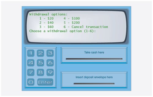 The cash dispenser begins each day loaded with 500 $20 bills. [Note: Owing to the limited scope of this case study, certain elements of the ATM described here do not accurately mimic those of a real ATM. For example, a real ATM typically contains a device that reads a user’s account number from an ATM card, whereas this ATM asks the user to type an account number using the keypad. A real ATM also usually prints a receipt at the end of a session, but all output from this ATM appears on the screen.]
