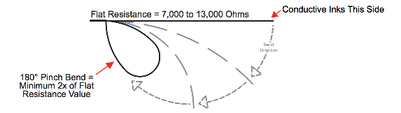 In this project, the sensors used are five Flexible Sensor. It can change its resistance due to the physical bend and flex. In addition, the range of the flat resistance of this sensor is 10K ohms ±30% and the bend resistance can be 2 times greater than the flat resistance at 180° pinch bend at least. The principle of how this sensor works is shown as follows: