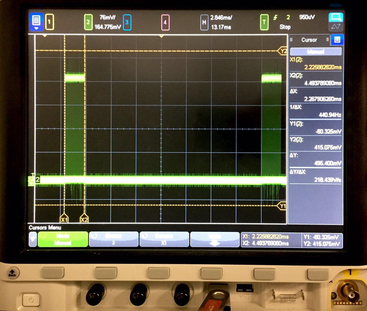 As can be seen on the screen, the communication signal is last for about 2.268ms, the interval between each set of signals is exactly 20ms. According to the codes, the interval is caused by the delay commend. Therefore, the communication signal containing five fingers’ data is last for 2.268ms, which is 441Hz. This result means when the commend of 20ms delay is removed, the sampling rate is 441Hz for five sensors and 2205Hz for one sensor.