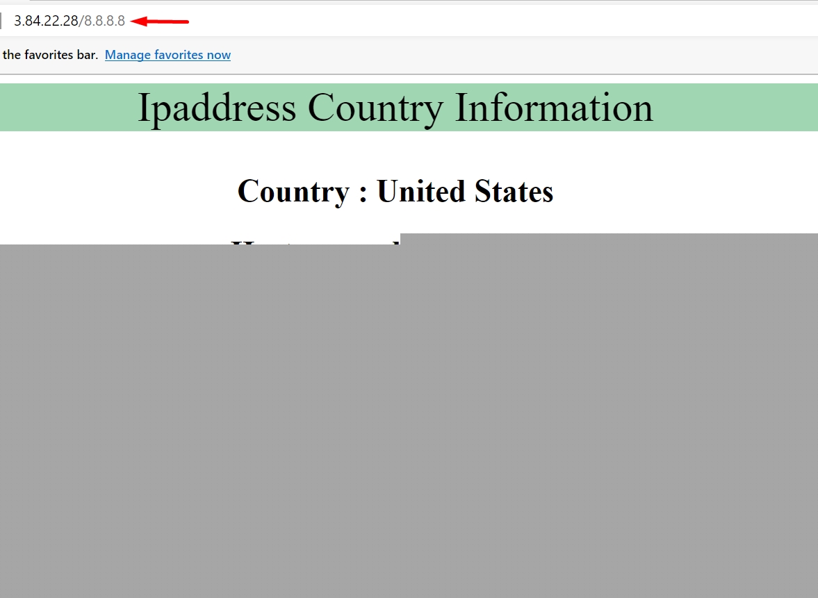 docker-compose --env-file env.dev up -d- Update with the IP of the which needs to find the geolocation as provided below. As per the sample page created, here it will display the details as provided below.