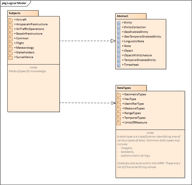 The AIRM has three components, viz. the Contextual Model, Conceptual Model and Logical Model. The AIRM Logical Model provides a (semantic) reference model of the data concepts for service architects and system implementers. It contains the information elements necessary to model the shared information of ATM. The following are examples from the conceptual and logical models on the same meteorological phenomenon turbulence:
