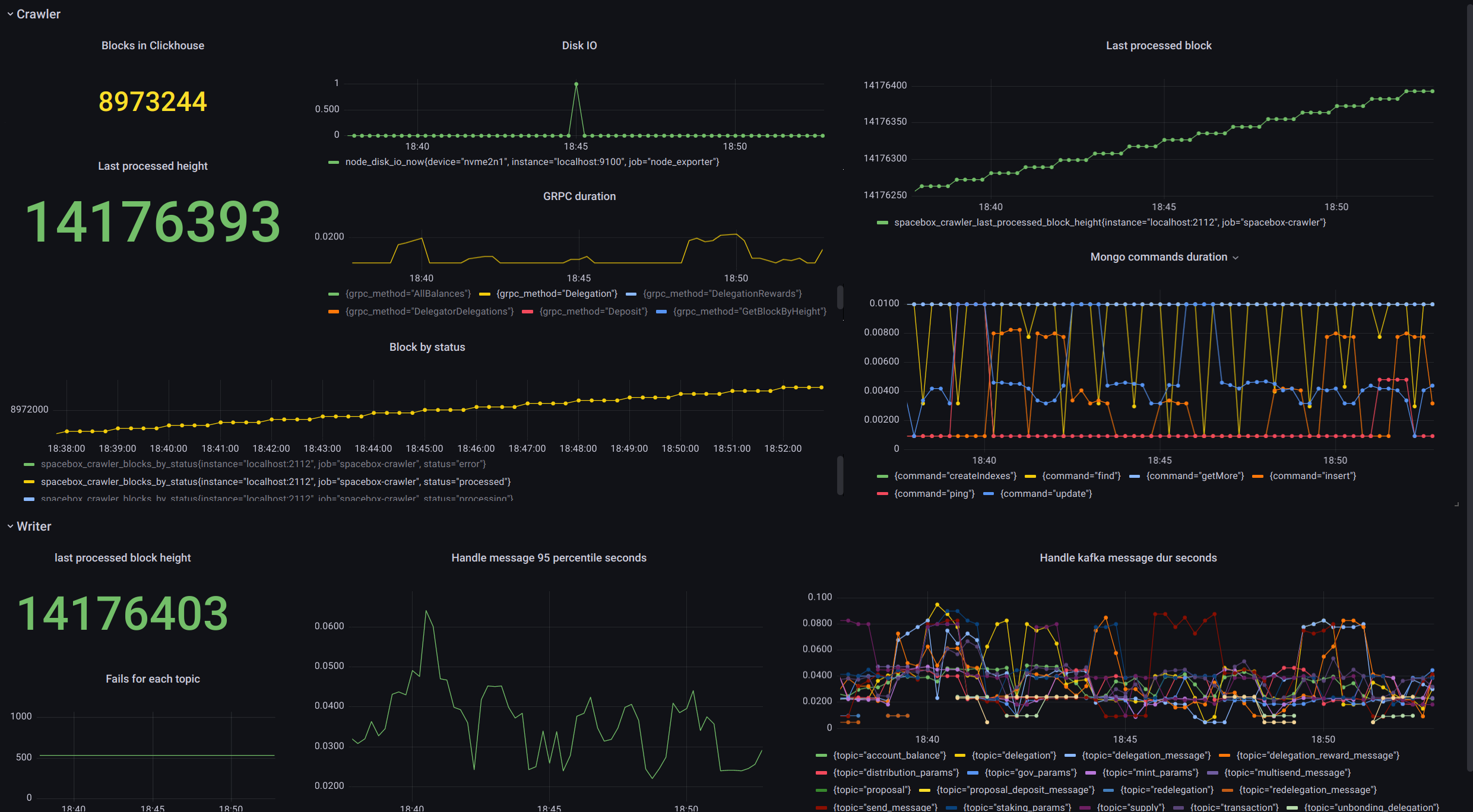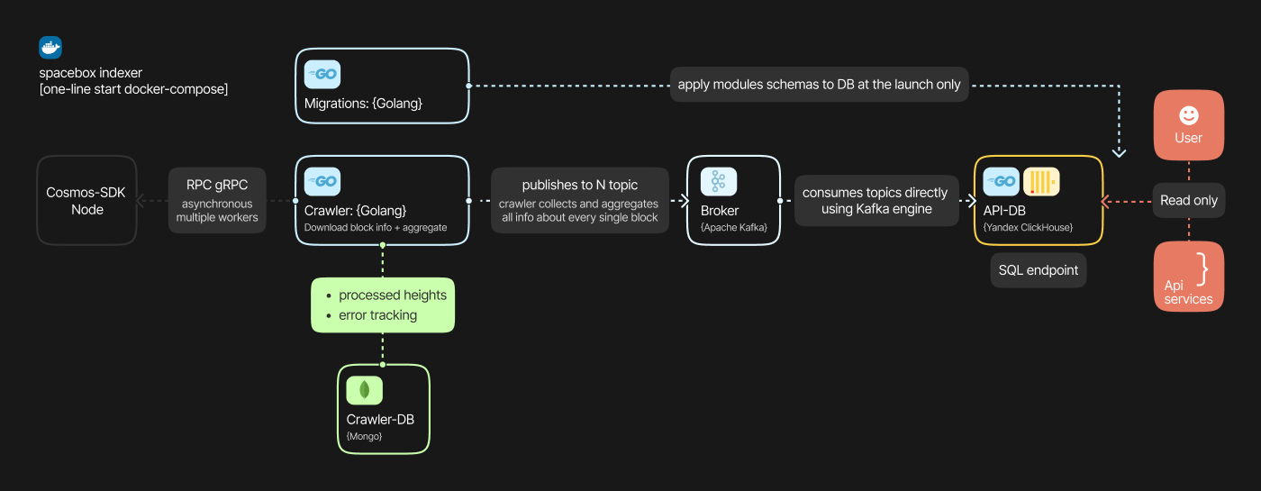 - Spacebox-crawler - pull and parce blocks, pass them to Kafka