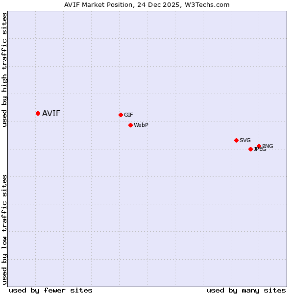 Based on this shortcoming one can imagine that avif is much less popular than the less than 2% popular webp... And you are right. The same site did a survey for avif too, the results are less than 0.5% of use as you can see by the charts below.