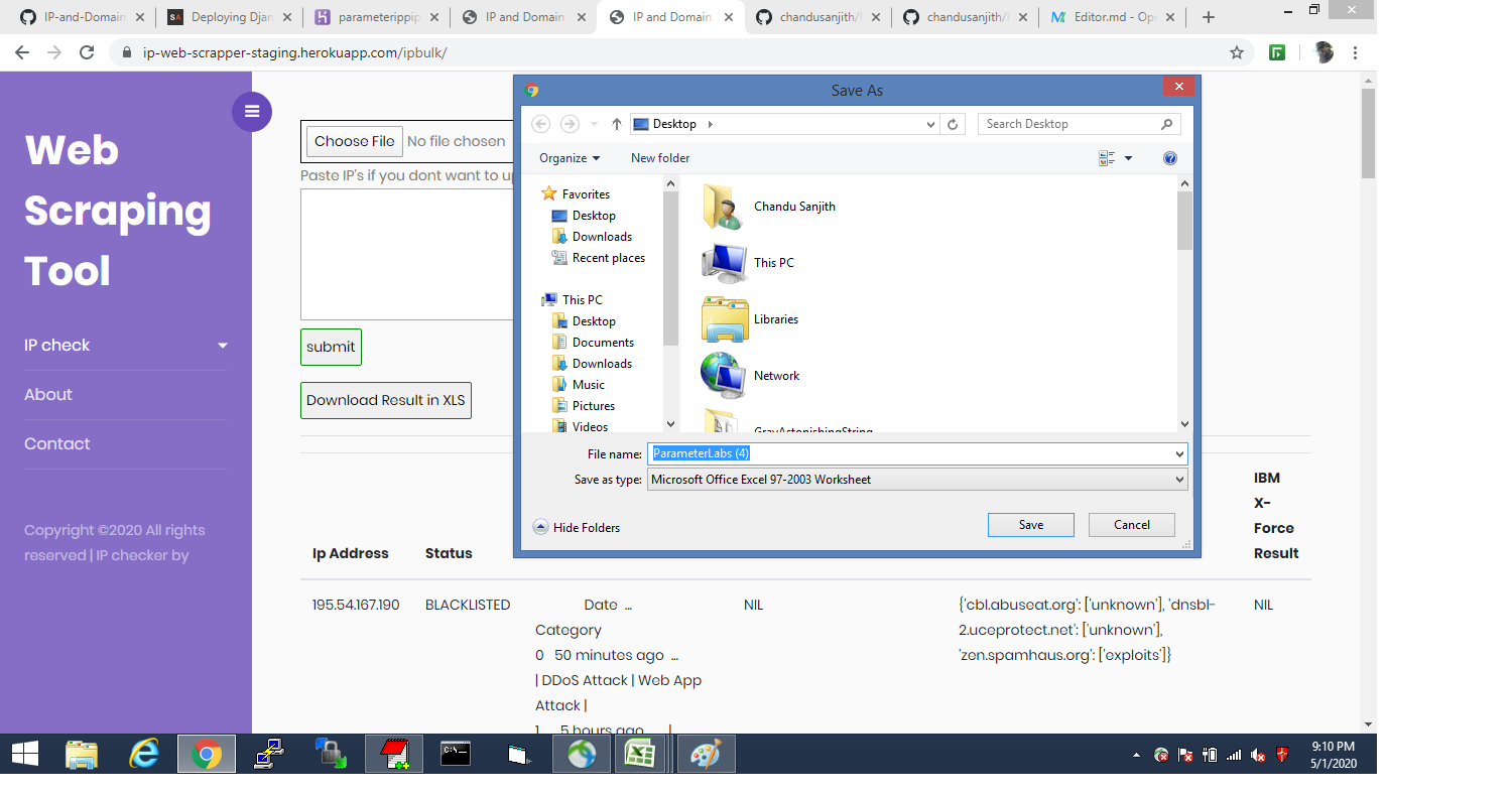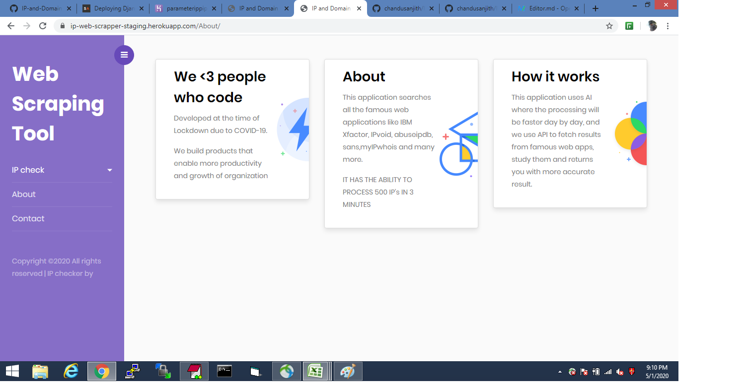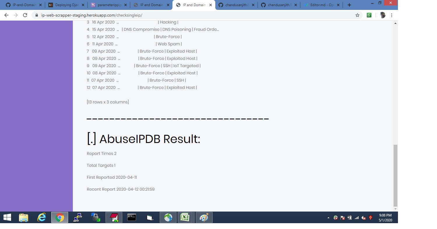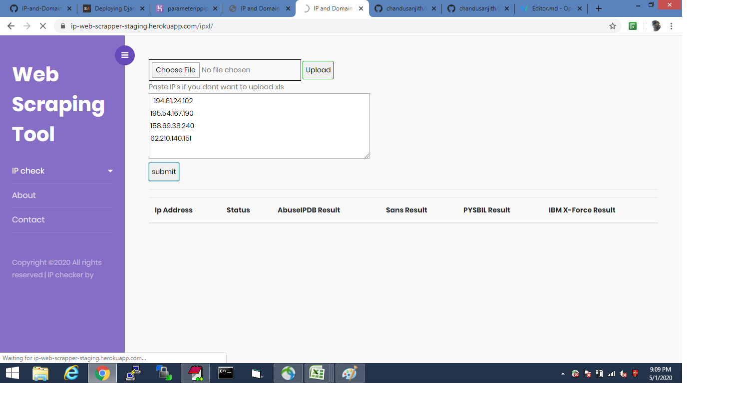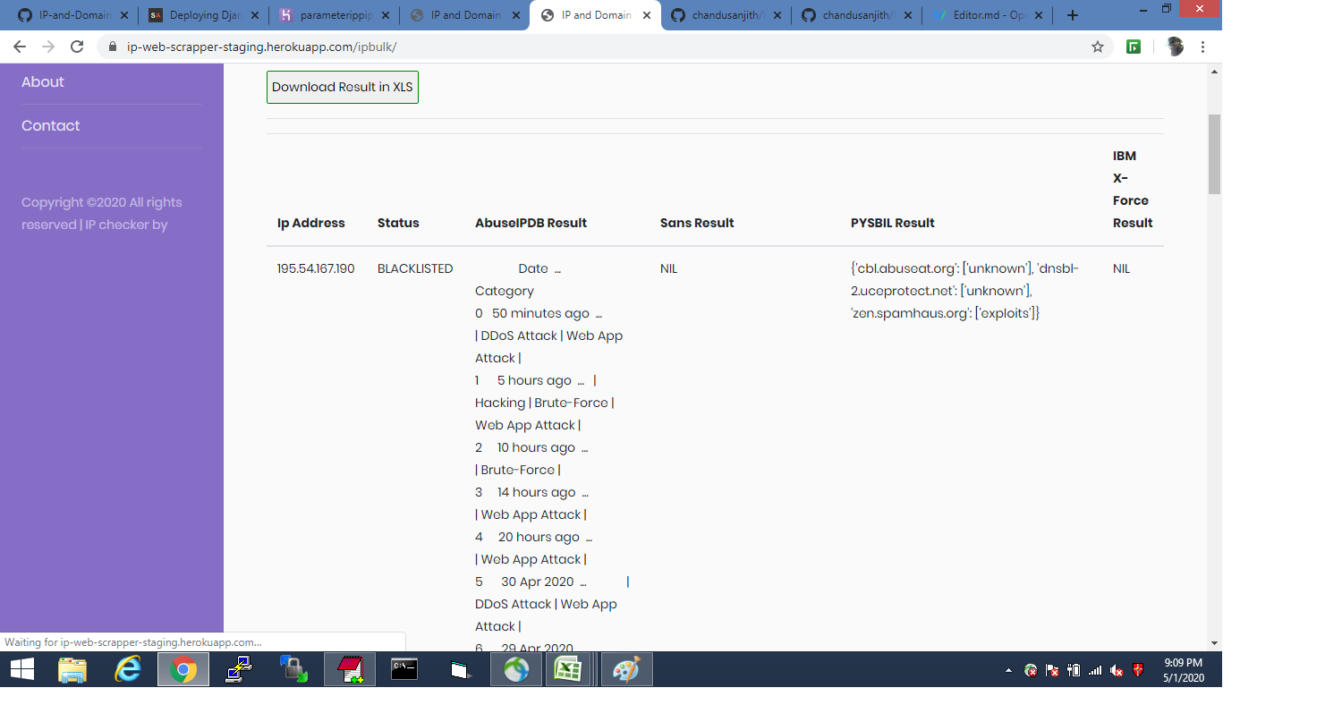 pip pip # IP AND DOMAIN REPUTATION CHECKER This web application checks if IP and domains are blocked or not in more than one websites, Organisations use different websites like ipvoid, IBM X force, virus total and many more, to check if an ip is blacklisted so they check each and every website for confirmation. So this application helps to check IP address in various blacklists (DNSBL, RBL). Such a check is a great indicator for an IP address’ reputation. Basically this application is processing 50 ips in 2 minutes, if more than 50 getting socket connection error.
