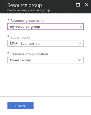 애저 포탈에서 리소스 그룹을 생성합니다. 이 리소스 그룹 이름은 이번 세션에서 계속 사용하게 되므로 별도로 메모해 둡니다.