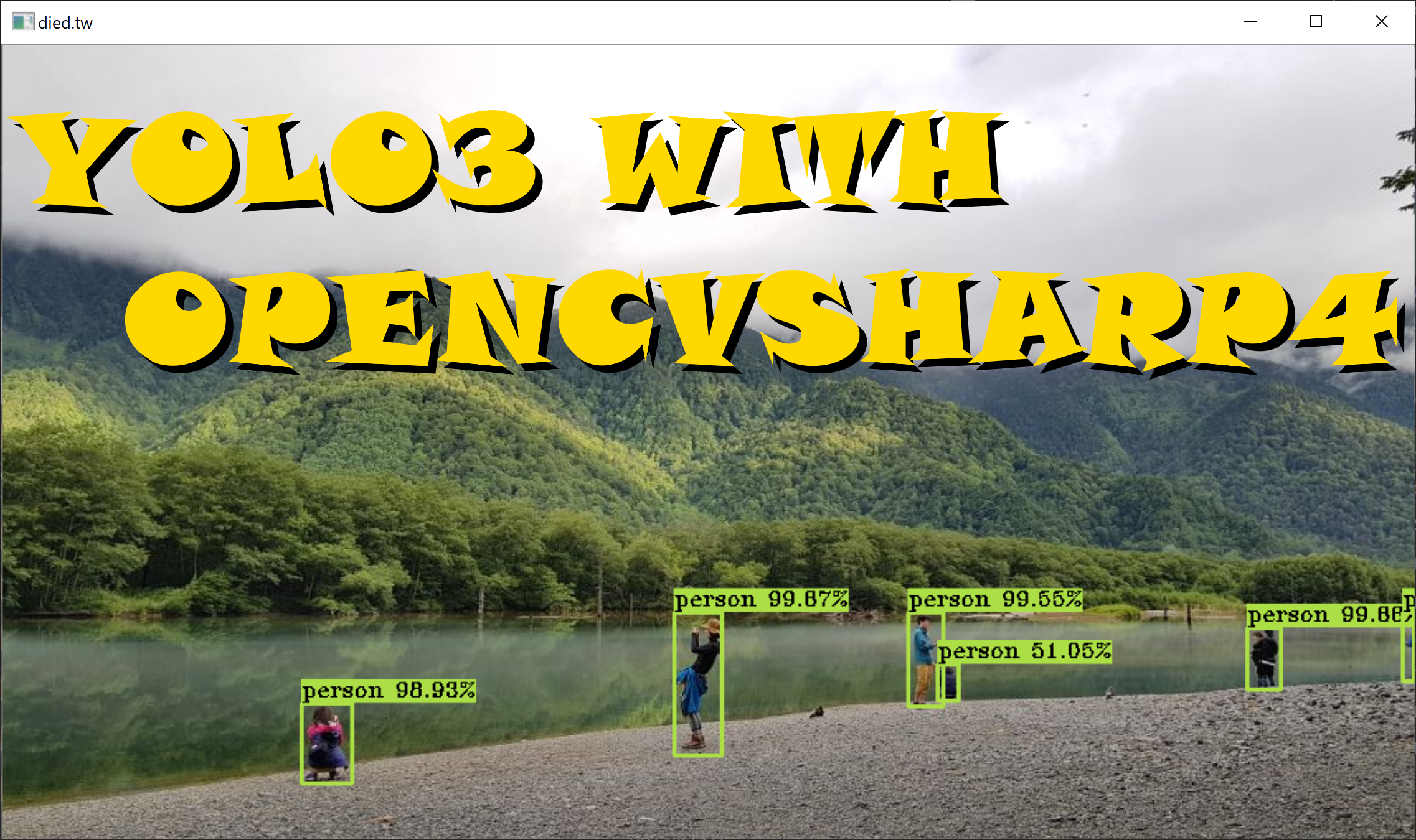 YOLO3 With OpenCvSharp4 This is a demo of implement pjreddie's YOLO3 with shimat's OpenCvSharp4 using C#. more detail please check blog artile : [C#] YOLO3 with OpenCvSharp4 Result