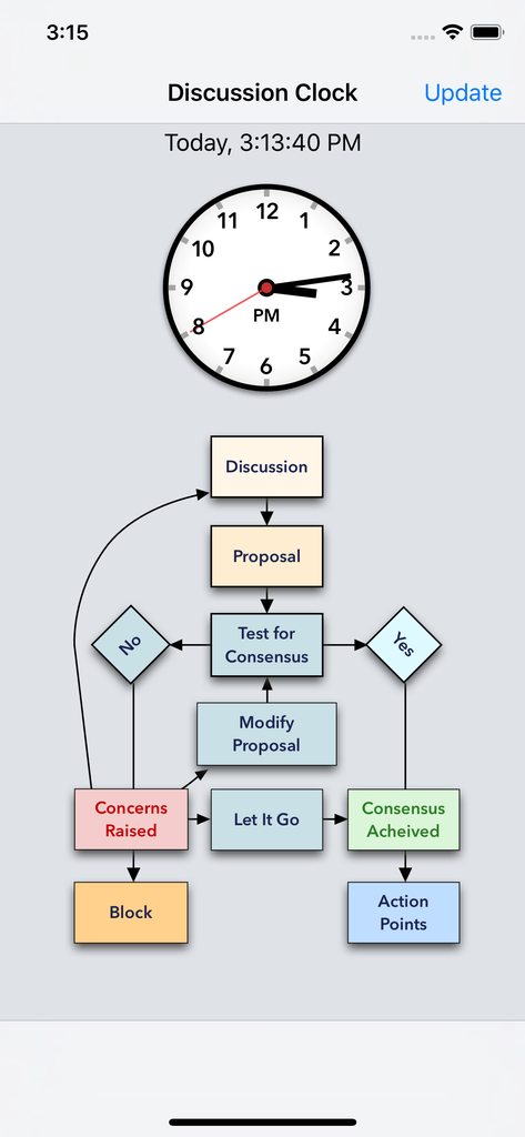- Test for Consensus blah blah ... These features will invite a user to record a discussion in real time and click into detail of what and when the points were made in the state diagram.