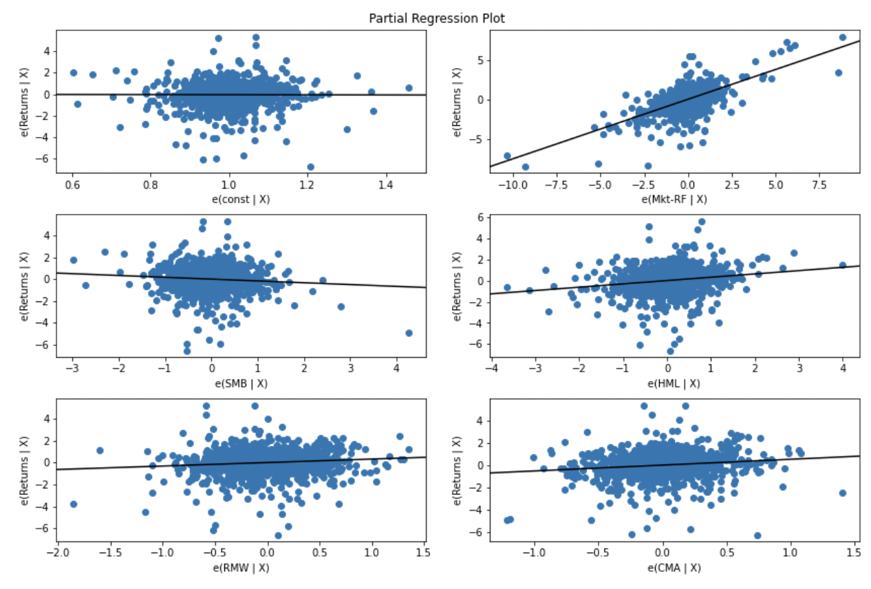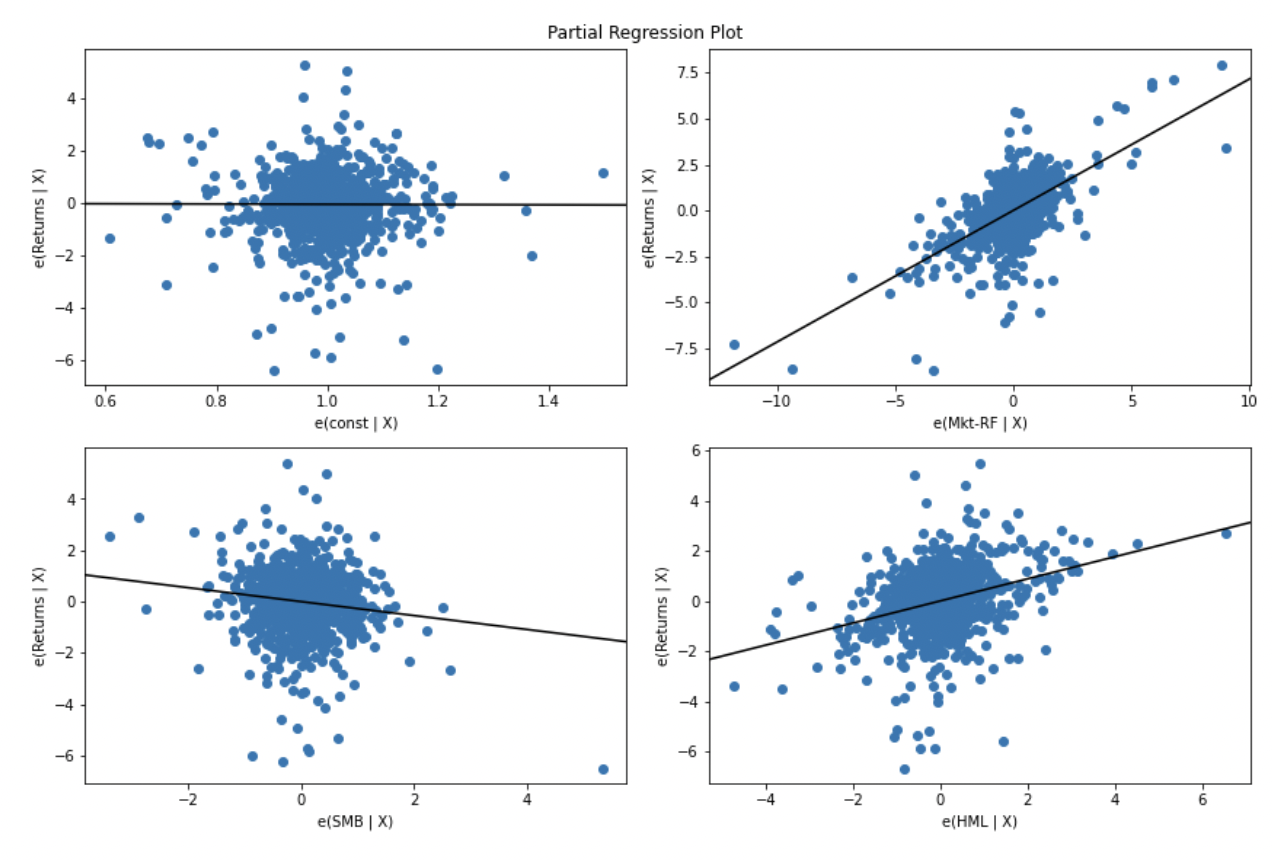 With Mkt-Rf on the X-axis, we see that as it goes up so do returns, which makes sense, as it had the highest coeffiecient. The other two variables had slight effects on the dependent variable.
