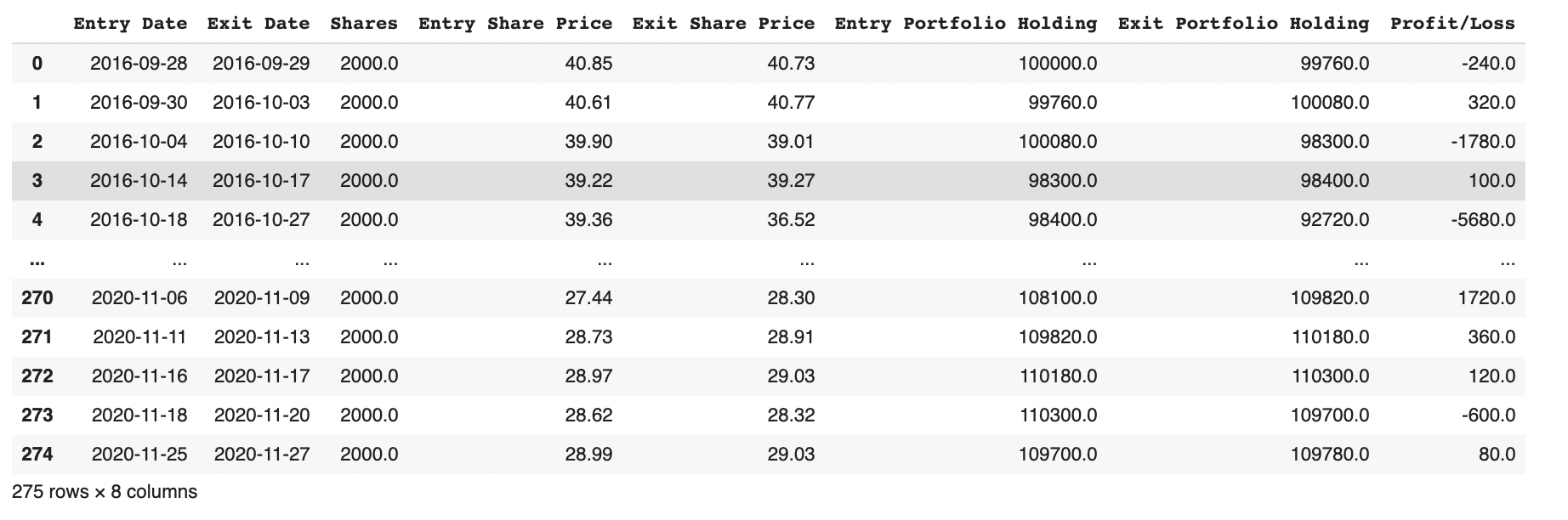 'Entry Date': entry_date, 'Exit Date': exit_date, 'Shares': share_size, 'Entry Share Price': entry_share_price, 'Exit Share Price': exit_share_price, 'Entry Portfolio Holding': entry_portfolio_holding, 'Exit Portfolio Holding': exit_portfolio_holding, 'Profit/Loss': profit_loss}, ignore_index=True)