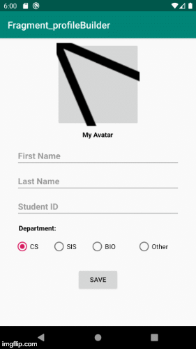 The application enables a new student to enter and edit their information, and save it using shared preferences making use of three fragments namely: My Profile (main screen), Select Avatar, and Display My Profile.