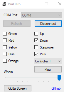 Hi, having this weird bug that tends to resolve itself after restarting wiihero.exe and unplugging arduino multiple times but basically when connecting to the arduino it maxes out the whammy and thinks I'm holding down strum & plus button (it also thinks up strum is green?)