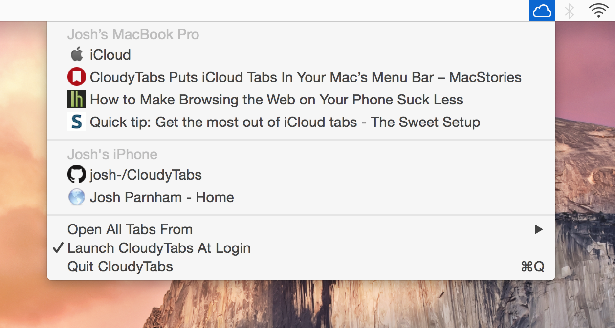 To use CloudyTabs, open the app and select a tab from one of your devices. The tab's URL then opens it in your default browser (useful if like me, you use Safari on iOS and Chrome on macOS), Cmd(⌘