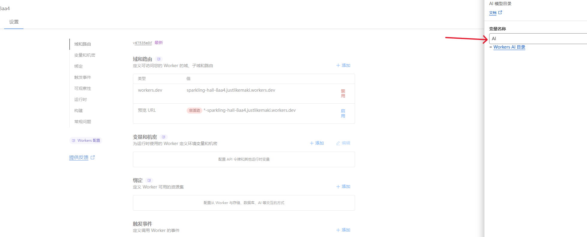部署该脚本需要绑定Workers AI,增加KV命名空间并绑定到IMAGE_KV。