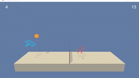 (For AWS) If you'd like to train the agent on AWS (and have not enabled a virtual screen), then please use this link to obtain the "headless" version of the environment. You will not be able to watch the agent without enabling a virtual screen, but you will be able to train the agent. (To watch the agent, you should follow the instructions to enable a virtual screen, and then download the environment for the Linux operating system above.) In this environment, two agents control rackets to bounce a ball over a net. If an agent hits the ball over the net, it receives a reward of +0.1. If an agent lets a ball hit the ground or hits the ball out of bounds, it receives a reward of -0.01. Thus, the goal of each agent is to keep the ball in play.