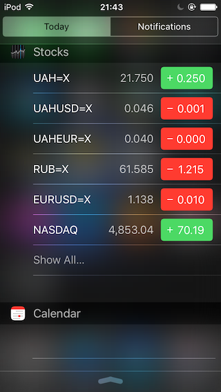 I would like to tell a little bit about how to create a simple Today Widget for iOS 8 and higher. We can find a lot of application in the store with widgets, really different widgets, such as weather, currencies, quick buttons for tracking something, location, etc. Example from my application, which displays currencies: