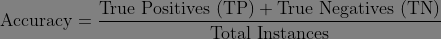 Definition: Accuracy measures the proportion of correctly predicted instances (positive and negative) out of the total instances.