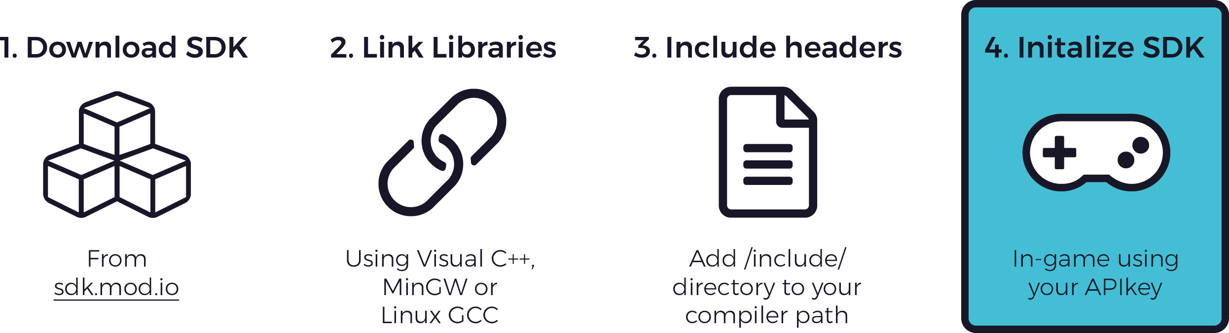 This page explains how to setup mod.io SDK into your game. Visual C++ and MinGW are supported for Windows, GCC for Linux and Clang for MacOS. Also, you can take a look at our Sample Projects showing the minimum setup required to start using mod.io on specific compilers.