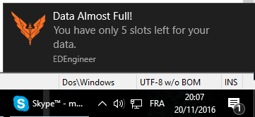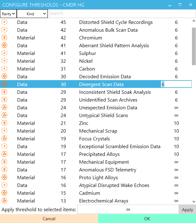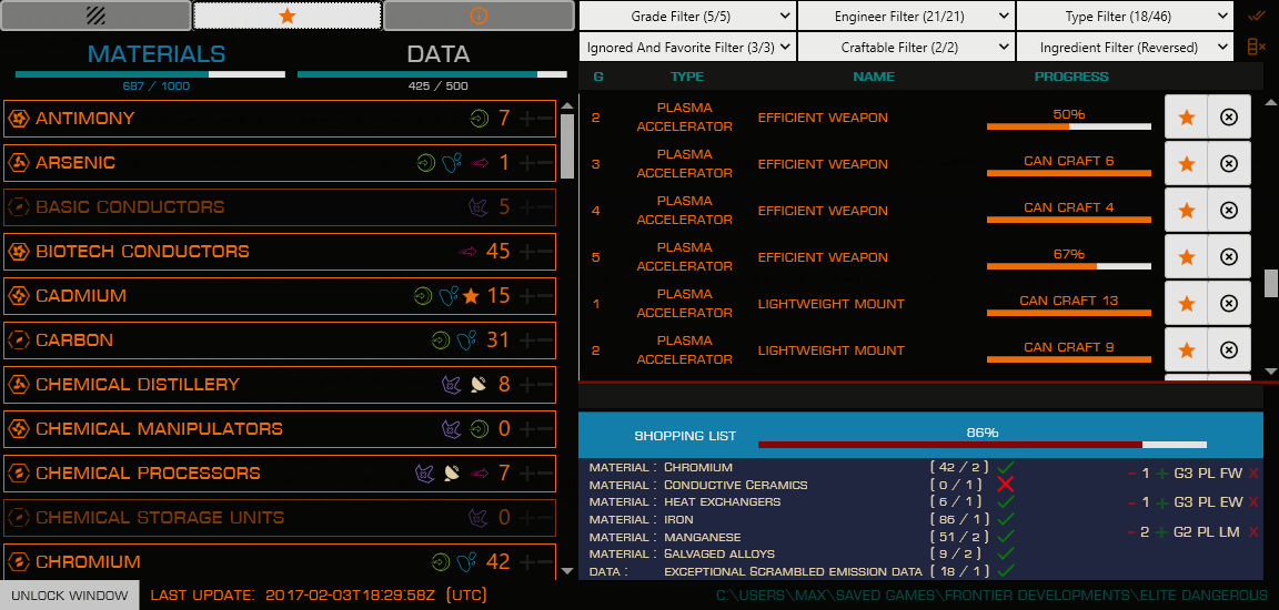 EDEngineer is a basic app I've written to track materials, data and cargo acquired in Elite Dangerous. That way, we can also track progress of blueprints available from the Engineers. Installer here.