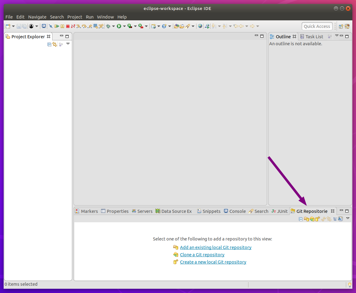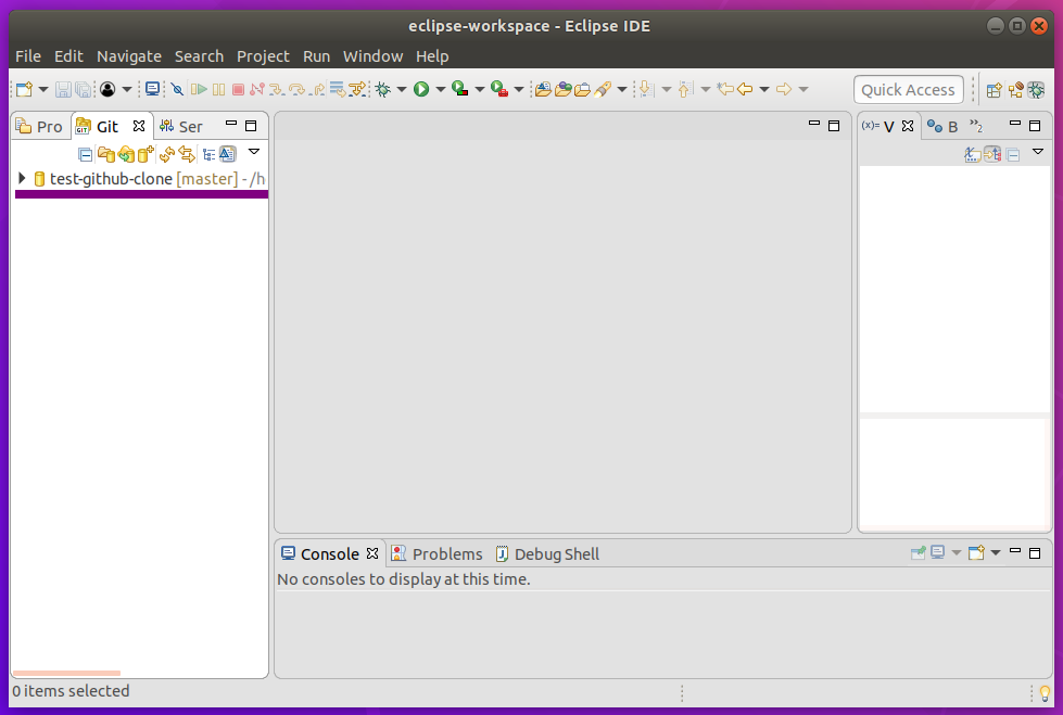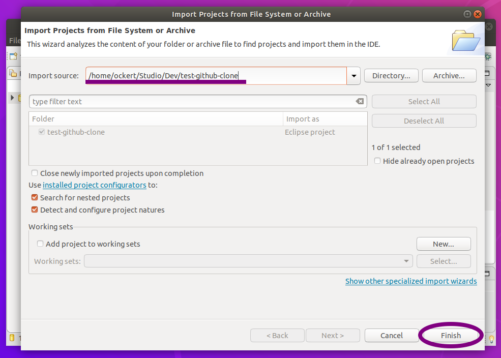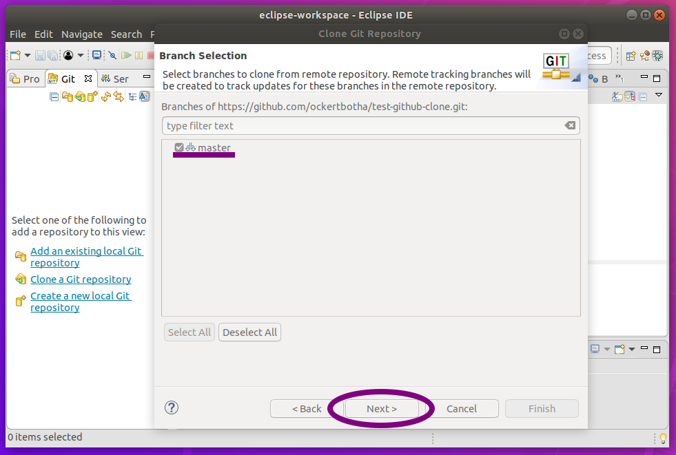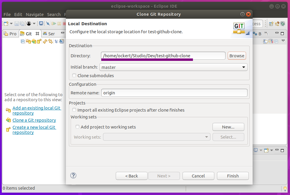First we'll import the cloned project into our workspace. On the 'Git' tab,