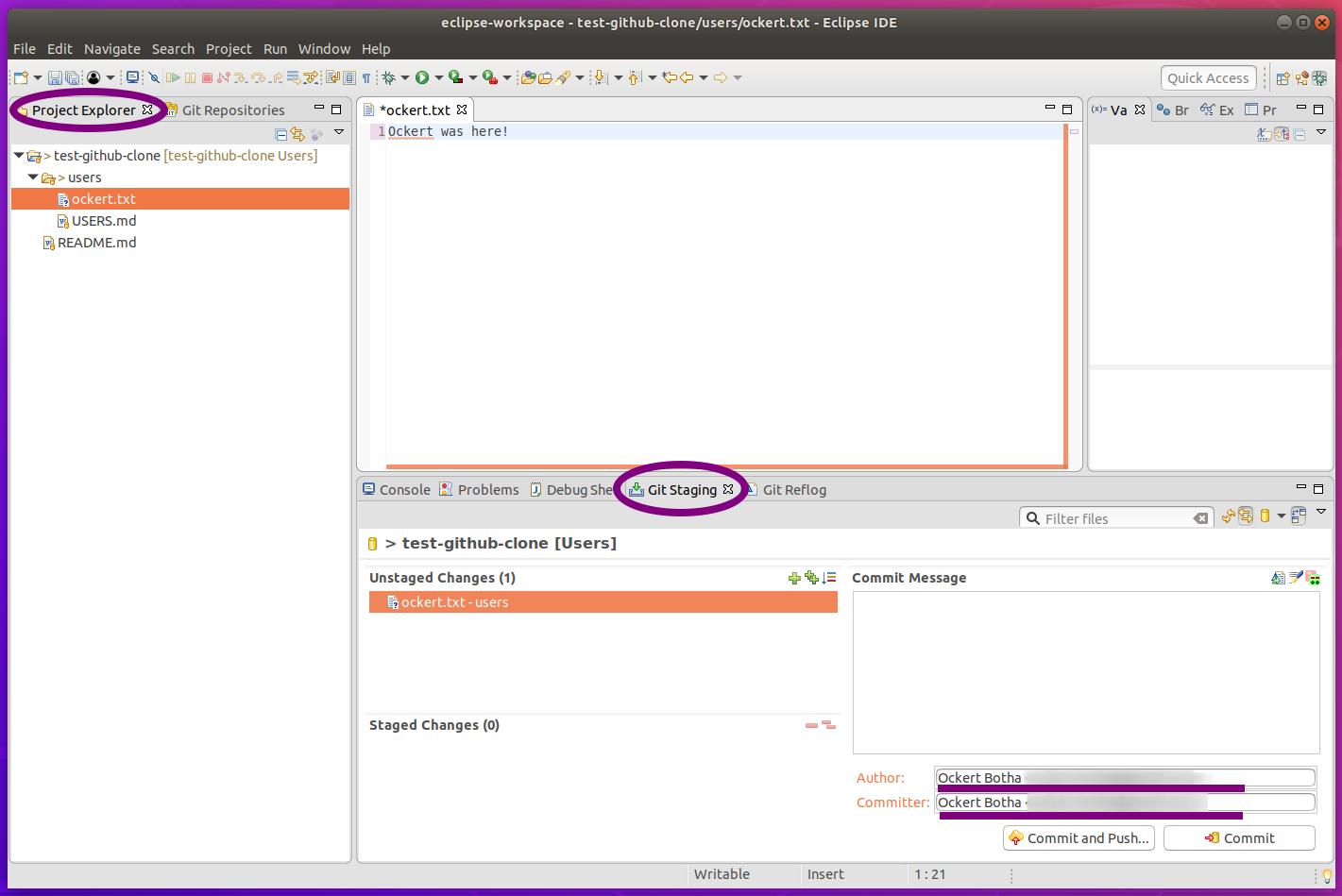 With the 'Git Staging' view still open, we're going to commit the new file.