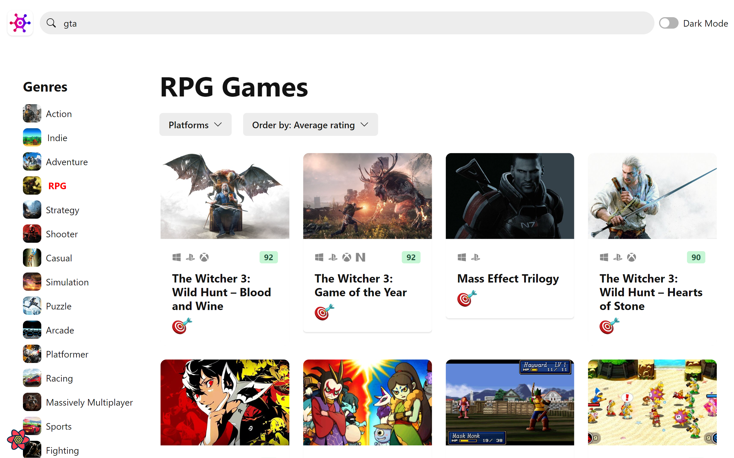 GameFiesta is a video game discovery web app that helps you find new and interesting games to play. With GameFiesta, you can search for games by platform, genre, and more. You can also view details about a game, such as its description, release date, and screenshots.