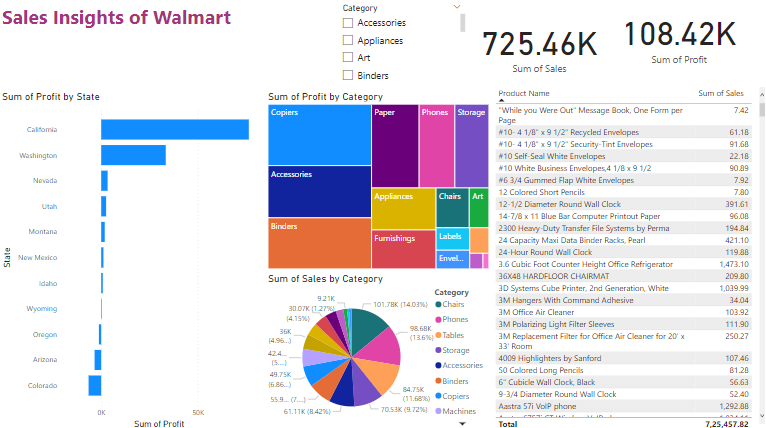 To start with the visualization, two card charts are created based on the sales and the profit, and followed by which the profit obtained by the walmart based on the category of item it solds to its customer are shown in a Treemap.