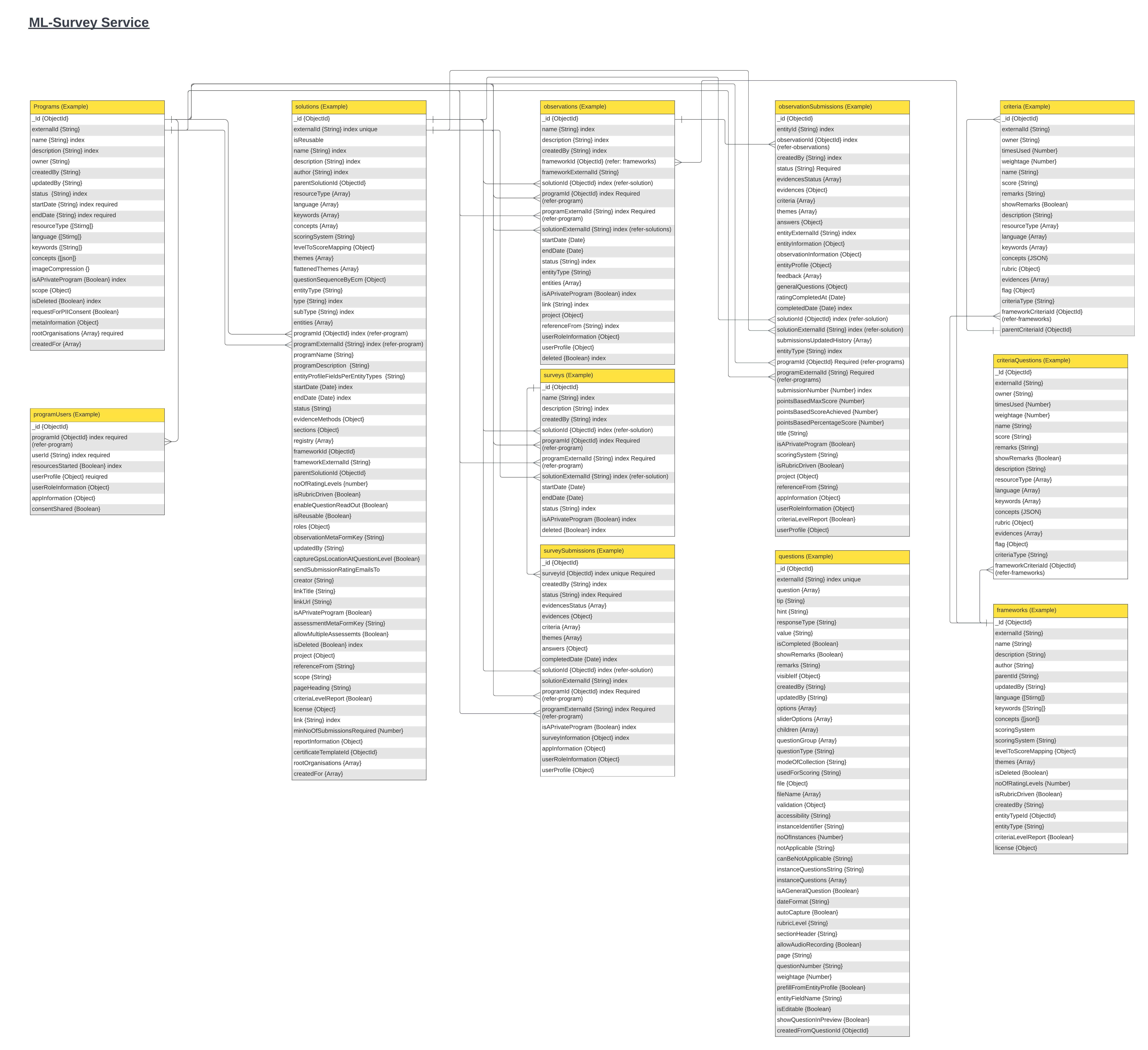 The schema serves as a blueprint for creating and maintaining the database that supports the ML survey services data storage and retrieval operations.