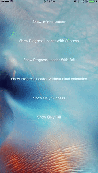 class func showWithProgress(initialValue value: CGFloat, onView: UIView, completionBlock: (() -> Void)?)You are able to show just the 'success' checkmark or fail with these methods: