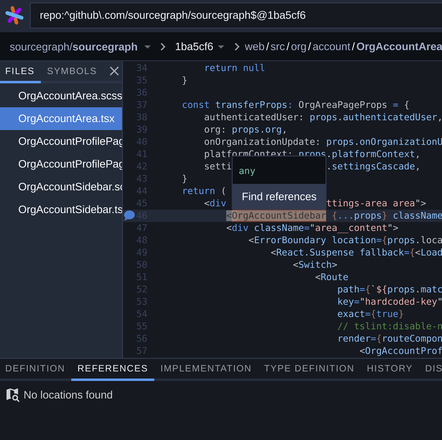 When I "Find references" on OrgAccountSidebar in <OrgAccountSidebar ... at https://sourcegraph.com/github.com/sourcegraph/sourcegraph@1ba5cf684eaeffa14d29ea36ddaf1c6f168949d1/-/blob/web/src/org/account/OrgAccountArea.tsx#L46:14&tab=references, it reports "No locations found":